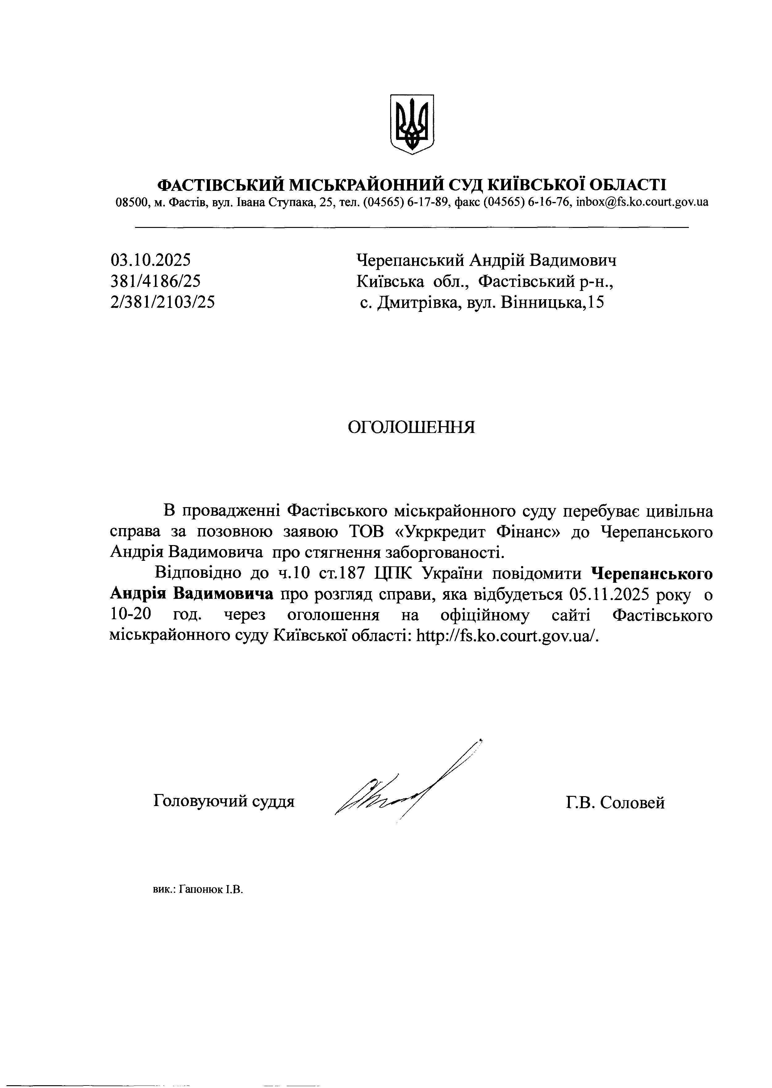 Черепанський Андрій Вадимович Київська обл., Фастівський р-н., с. Дмитрівка, вул. Вінницька, 15