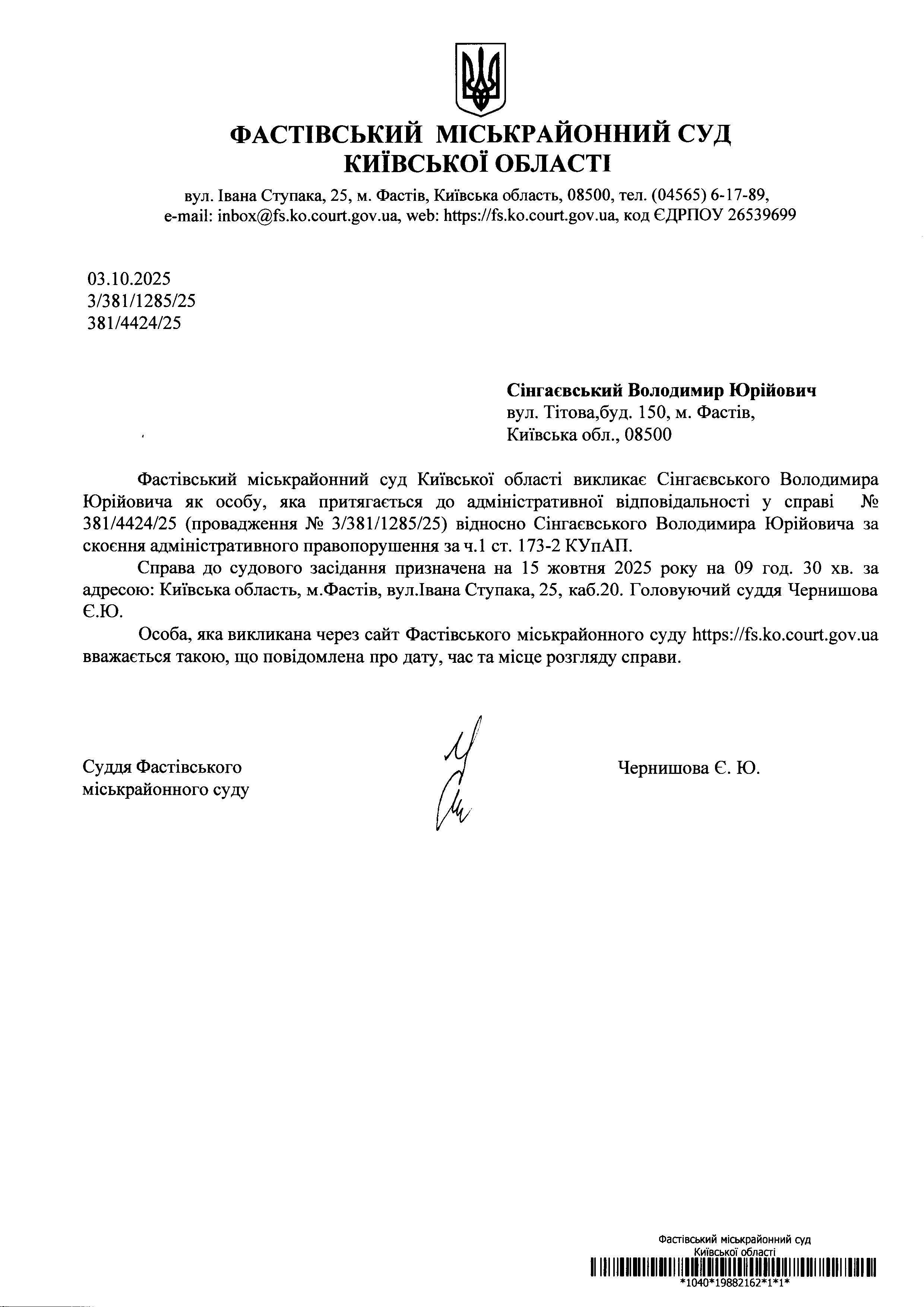 Сінгаєвський Володимир Юрійович вул. Тітова,буд. 150, м. Фастів,