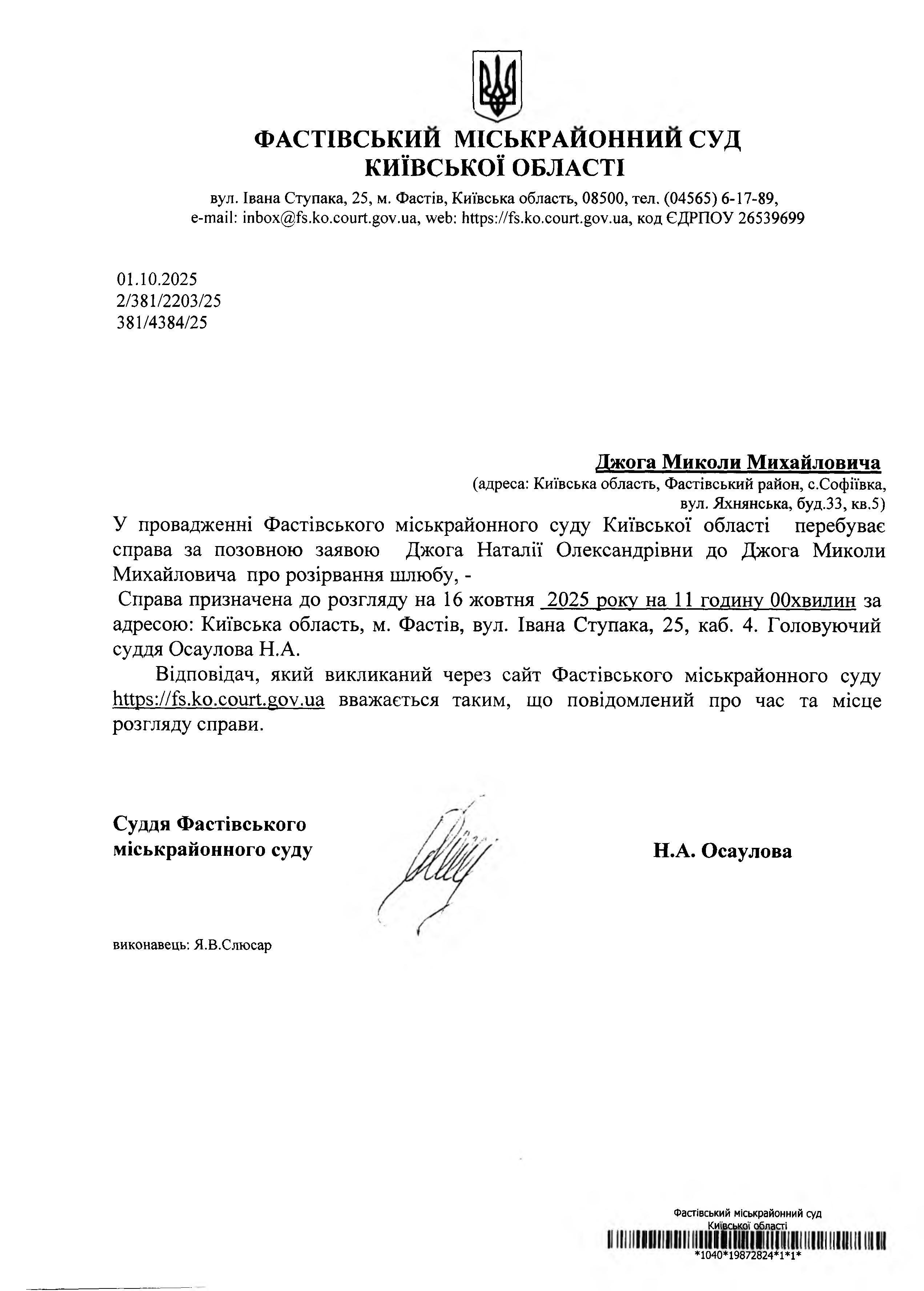 Джога Миколи Михайловича (адреса: Київська область, Фастівський район, с.Софіївка,
