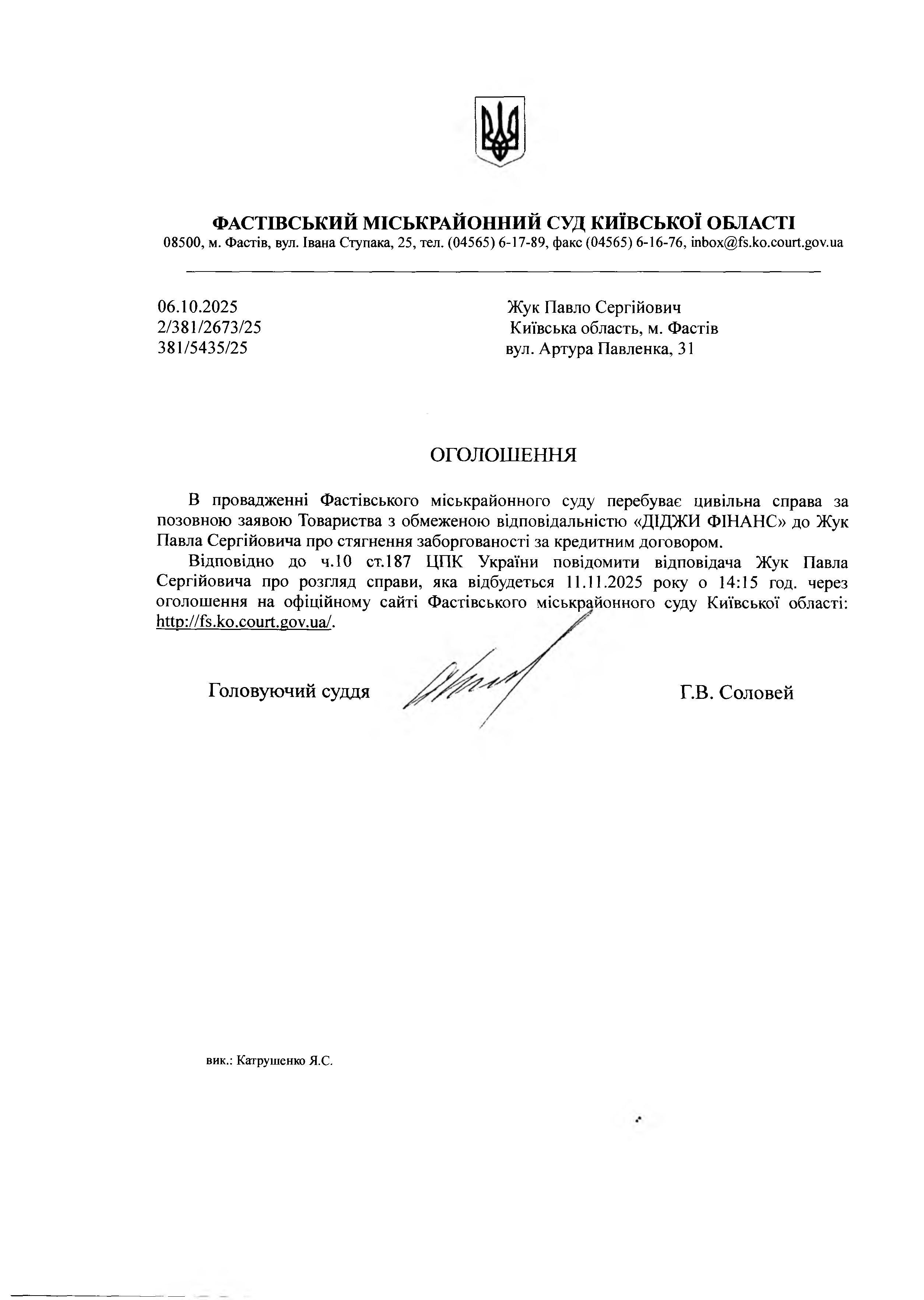 Жук Павло Сергійович Київська область, м. Фастів вул. Артура Павленка, 31