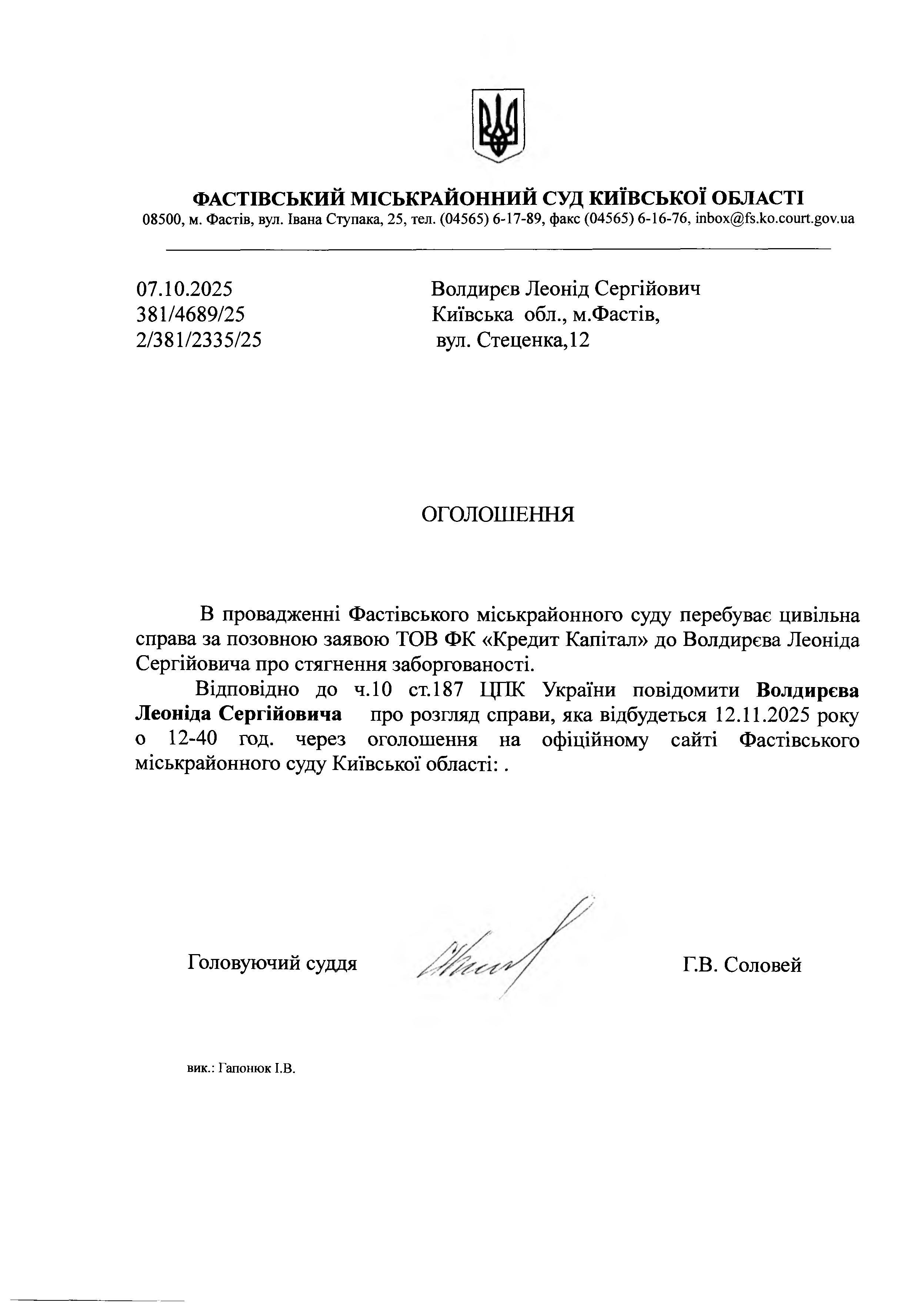 Волдирєв Леонід Сергійович Київська обл., м.Фастів, вул. Стеценка,12