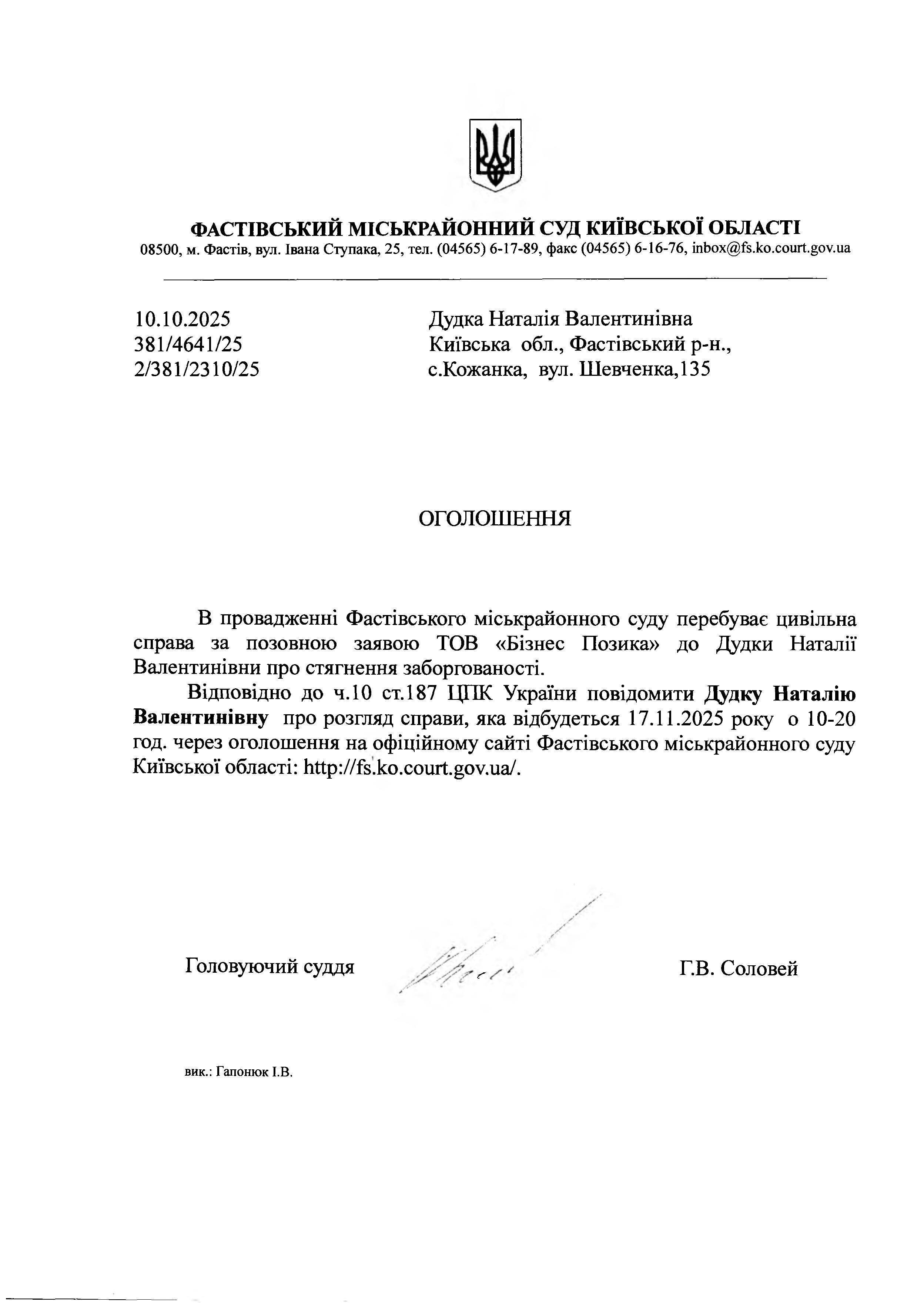 Дудка Наталія Валентинівна Київська обл., Фастівський р-н., с.Кожанка, вул. Шевченка, 135