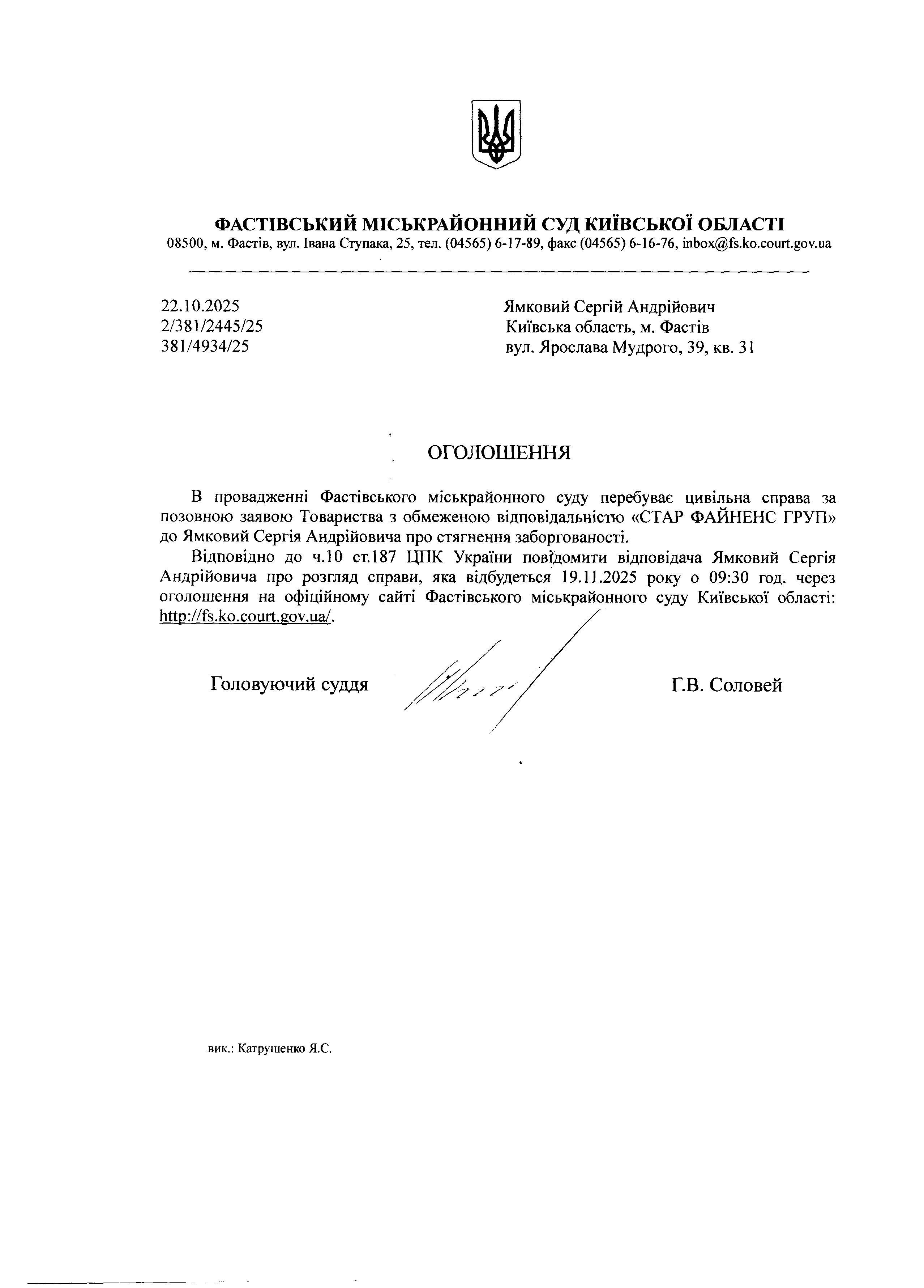 Ямковий Сергій Андрійович Київська область, м. Фастів вул. Ярослава Мудрого, 39, кв. 31