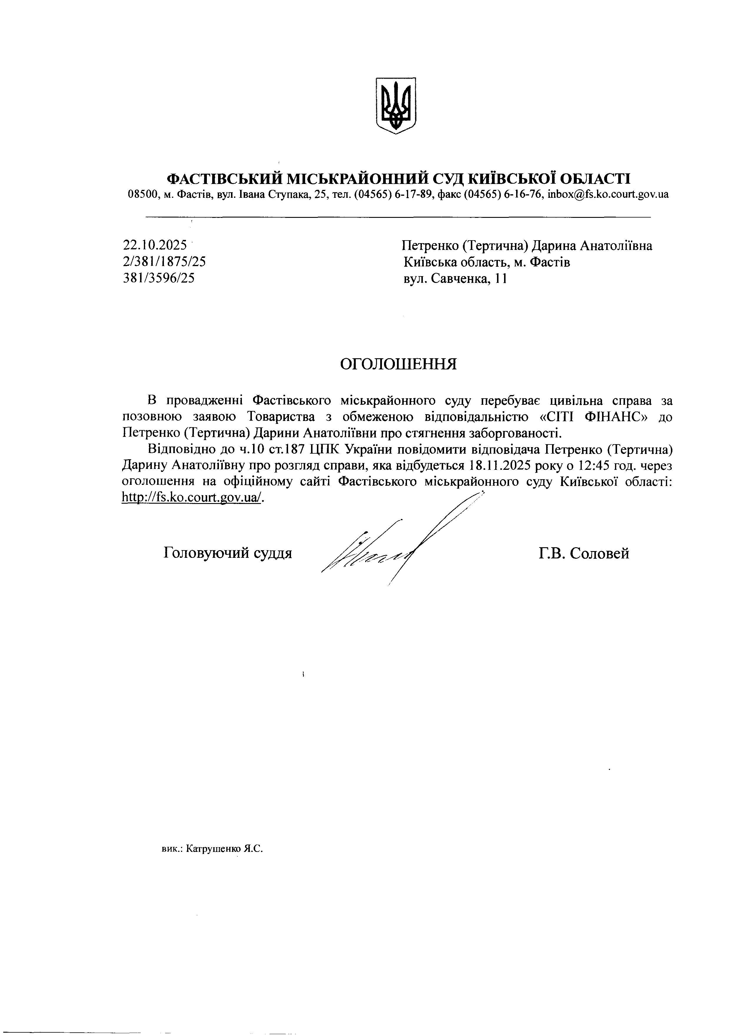 Петренко (Тертична) Дарина Анатоліївна Київська область, м. Фастів вул. Савченка, 11