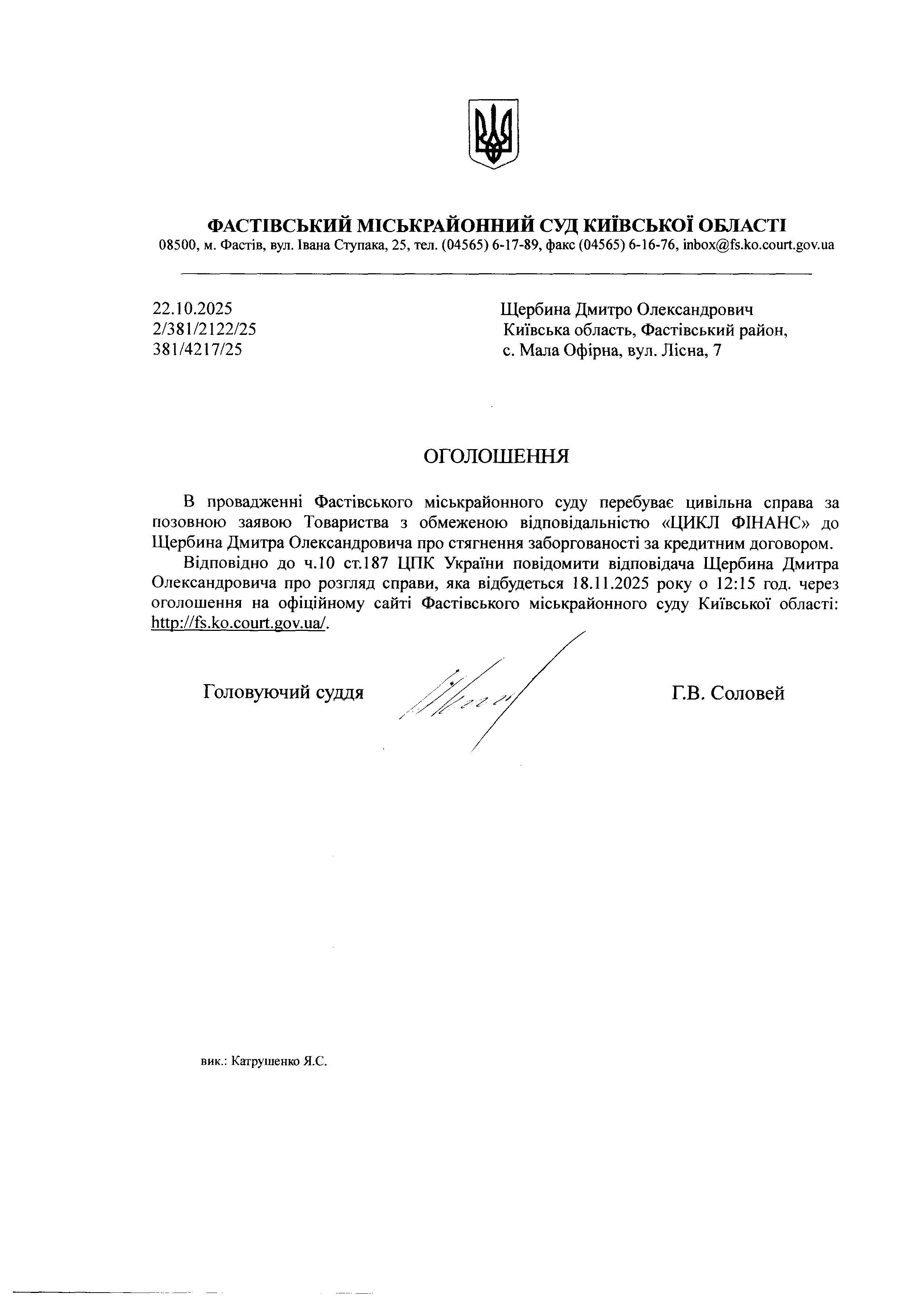 Щербина Дмитро Олександрович Київська область, Фастівський район, с. Мала Офірна, вул. Лісна, 7