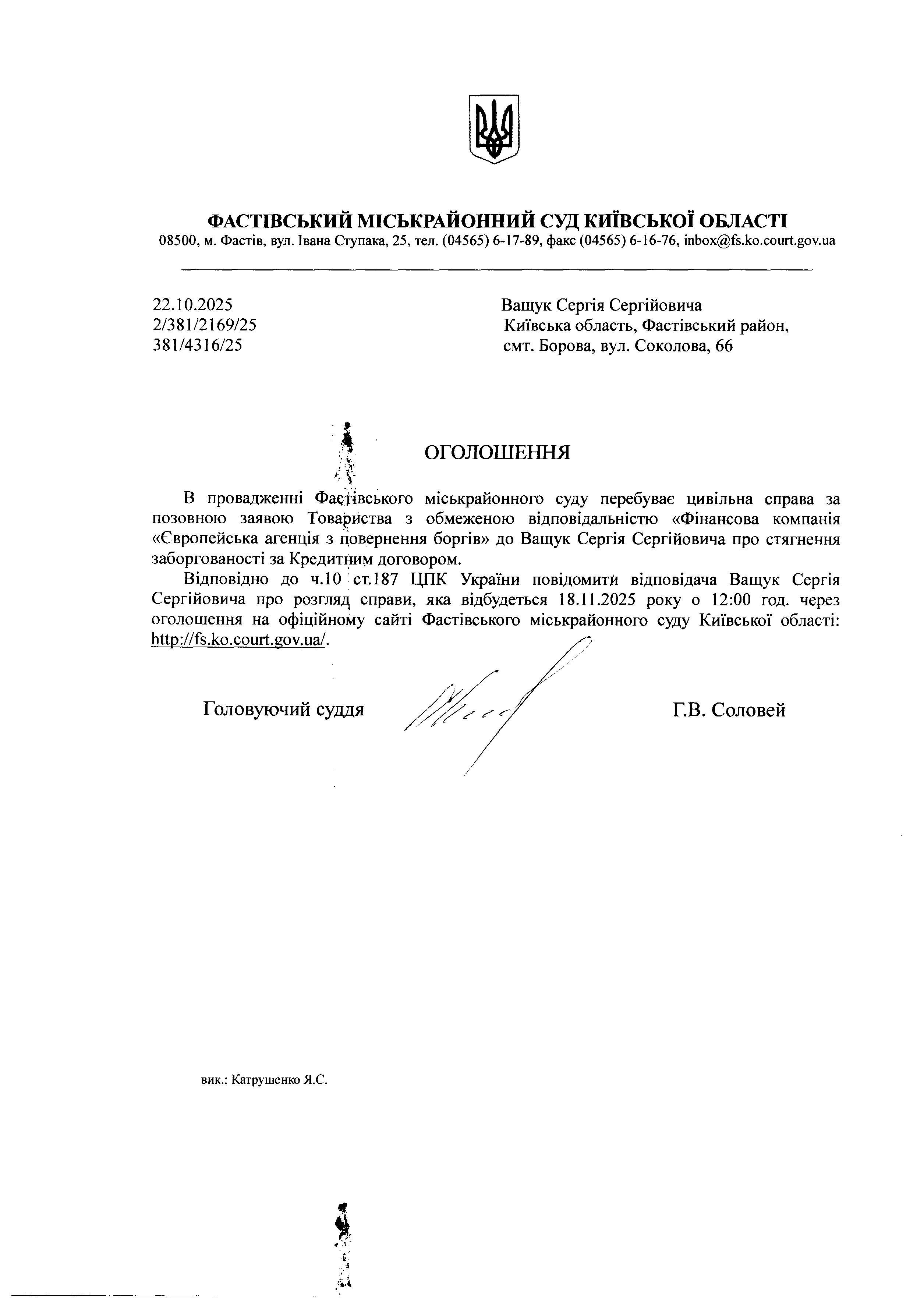 Ващук Сергія Сергійовича Київська область, Фастівський район, смт. Борова, вул. Соколова, 66