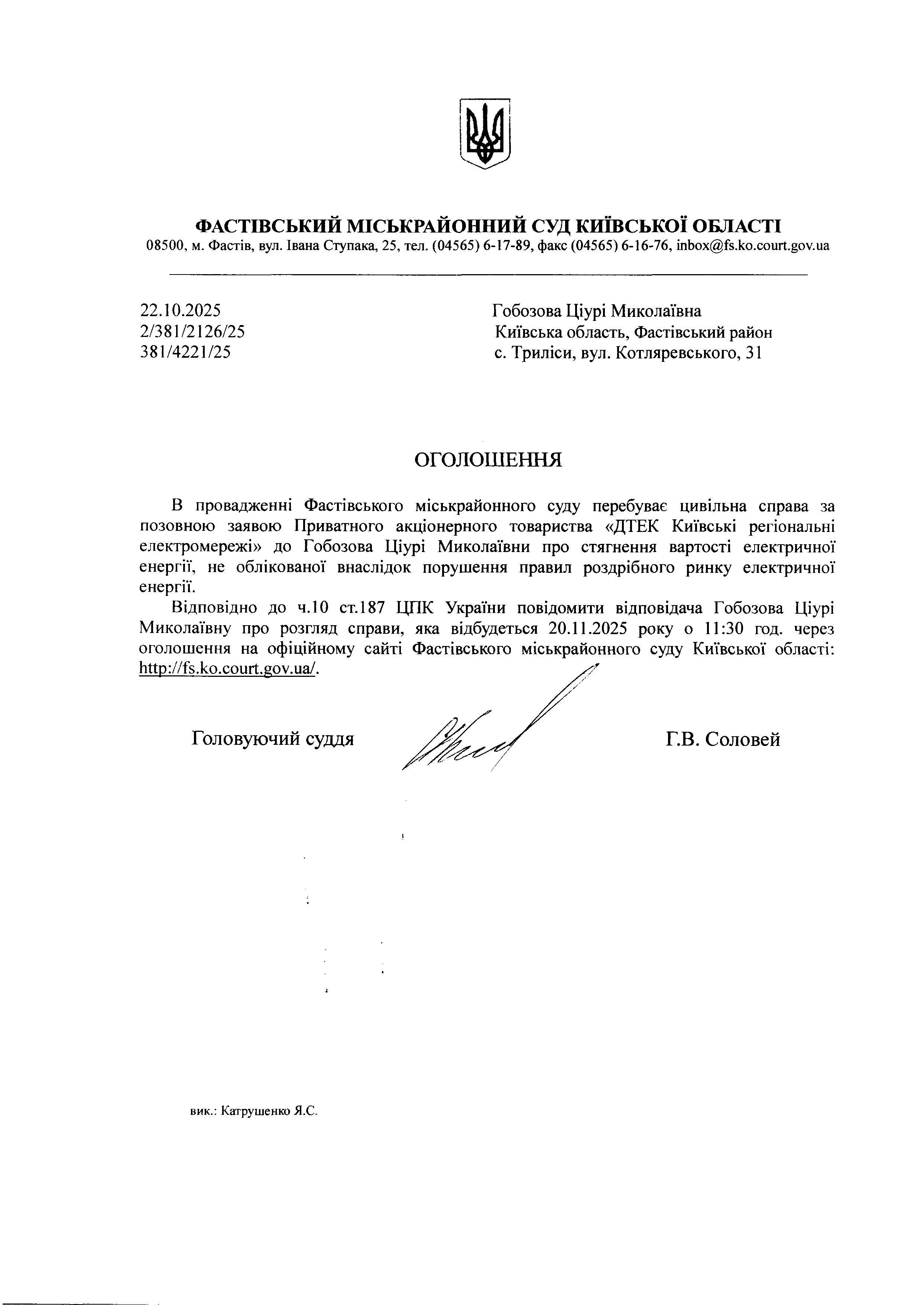 Гобозова Ціурі Миколаївна Київська область, Фастівський район с. Триліси, вул. Котляревського, 31