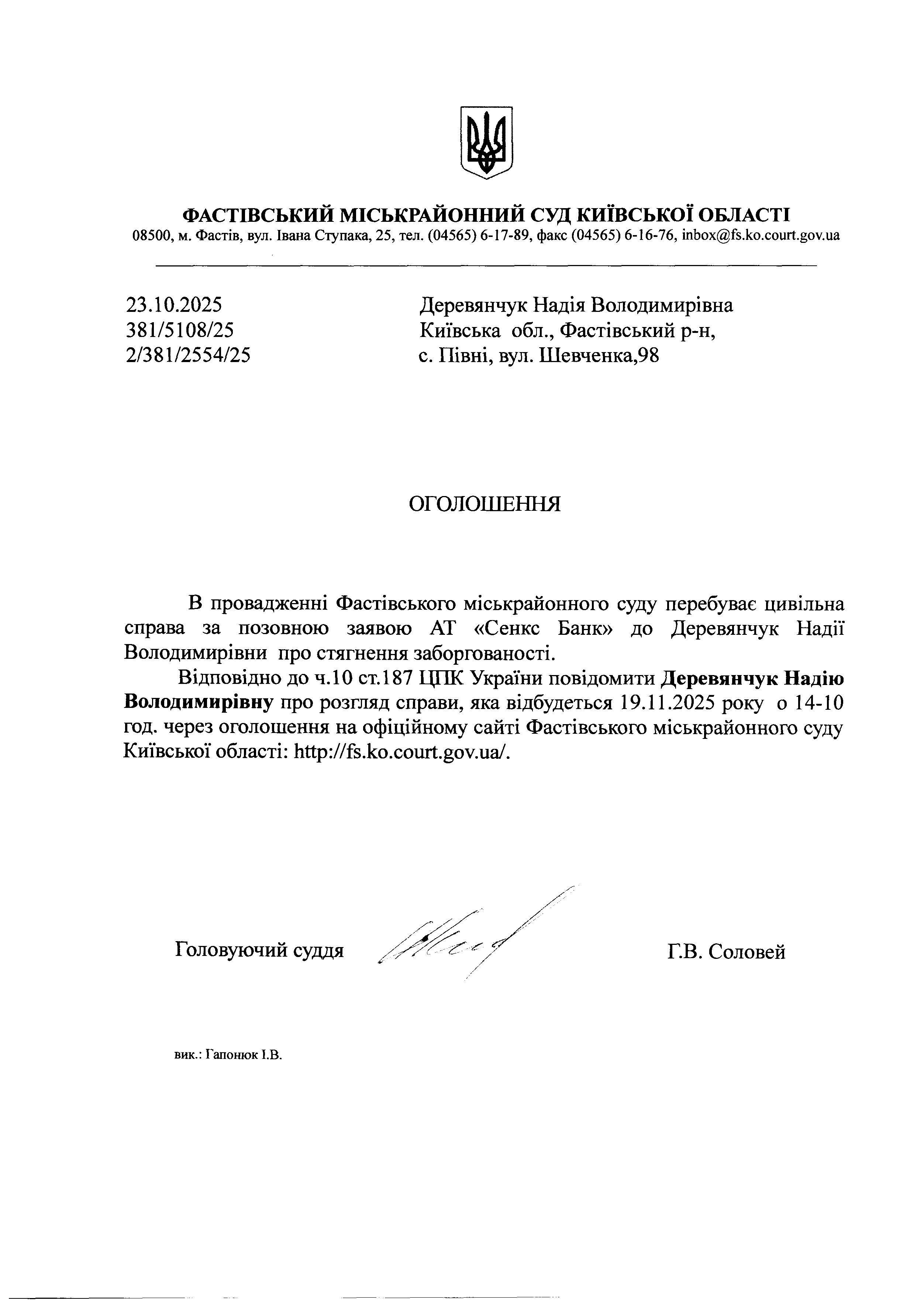Деревянчук Надія Володимирівна Київська обл., Фастівський р-н, с. Півні, вул. Шевченка,98