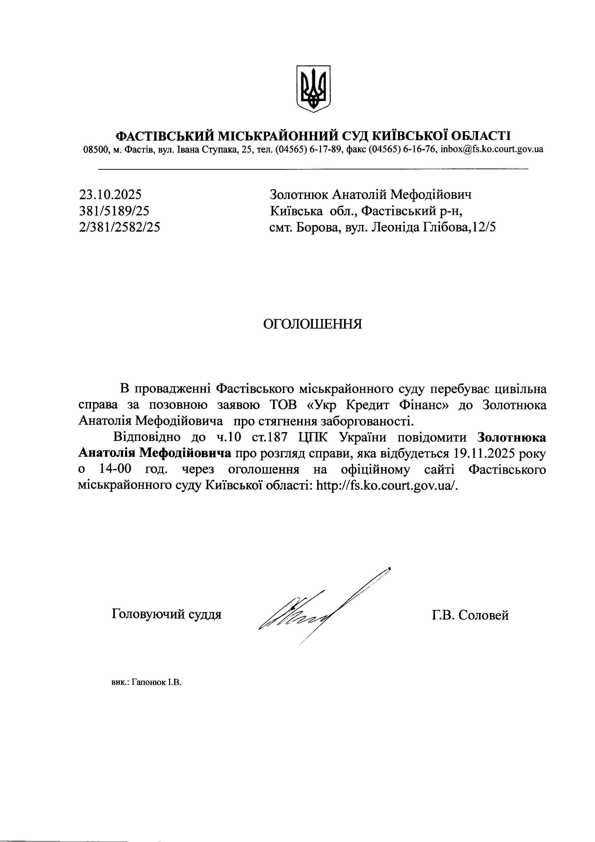 Золотнюк Анатолій Мефодійович Київська обл., Фастівський р-н, смт. Борова, вул. Леоніда Глібова,12/5