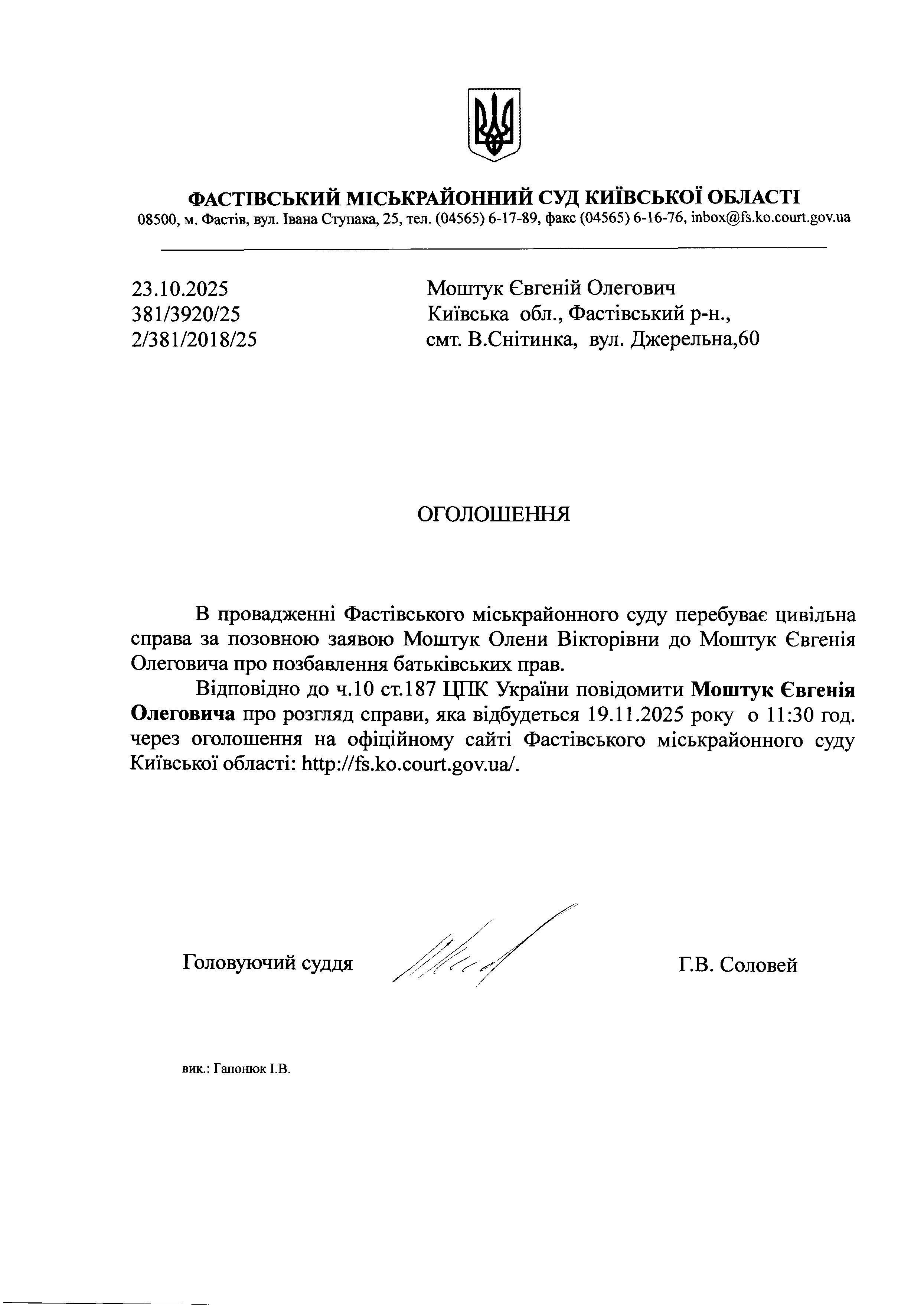 Моштук Євгеній Олегович Київська обл., Фастівський р-н., смт. В.Снітинка, вул. Джерельна,60