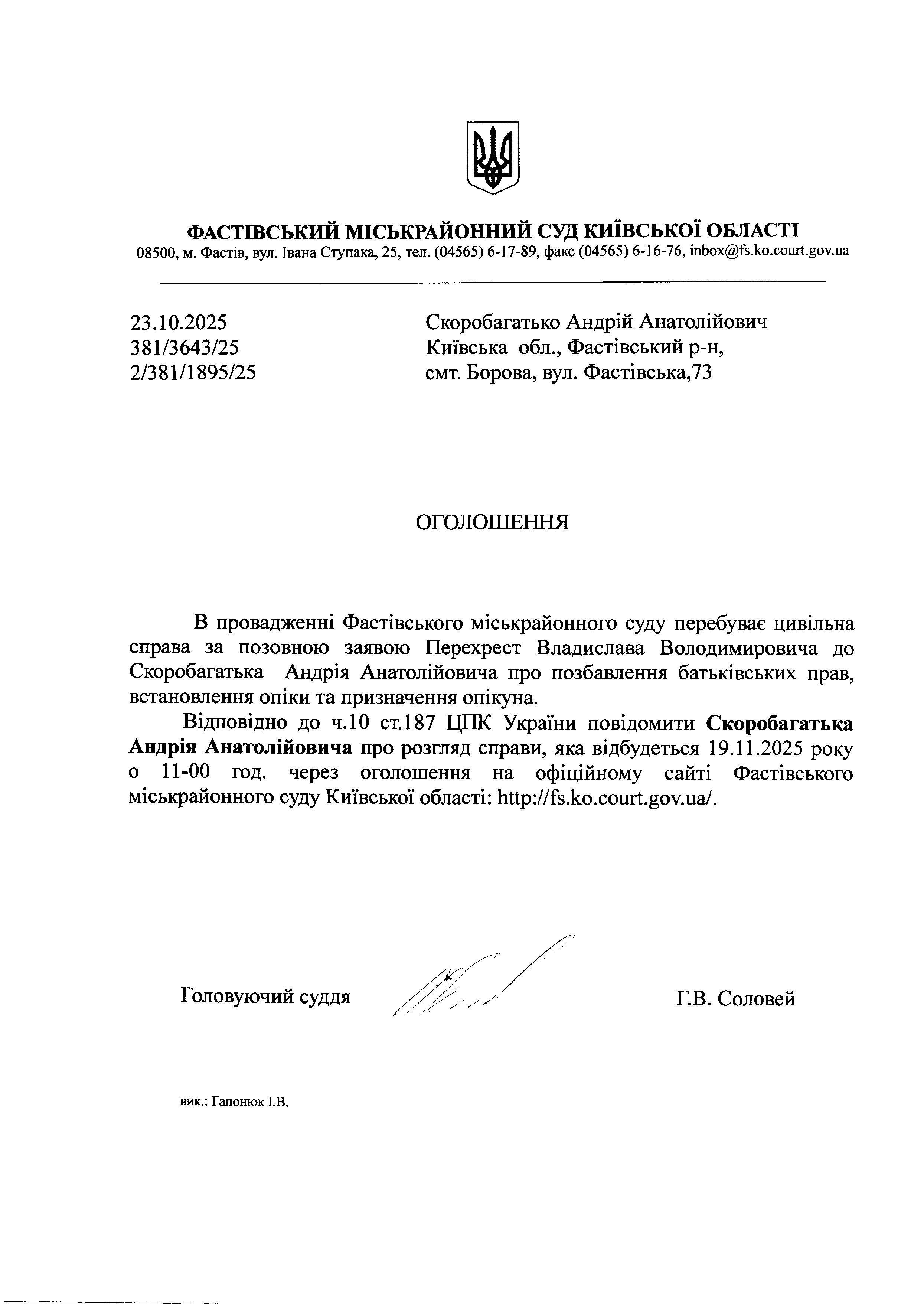 Скоробагатько Андрій Анатолійович Київська обл., Фастівський р-н, смт. Борова, вул. Фастівська,73