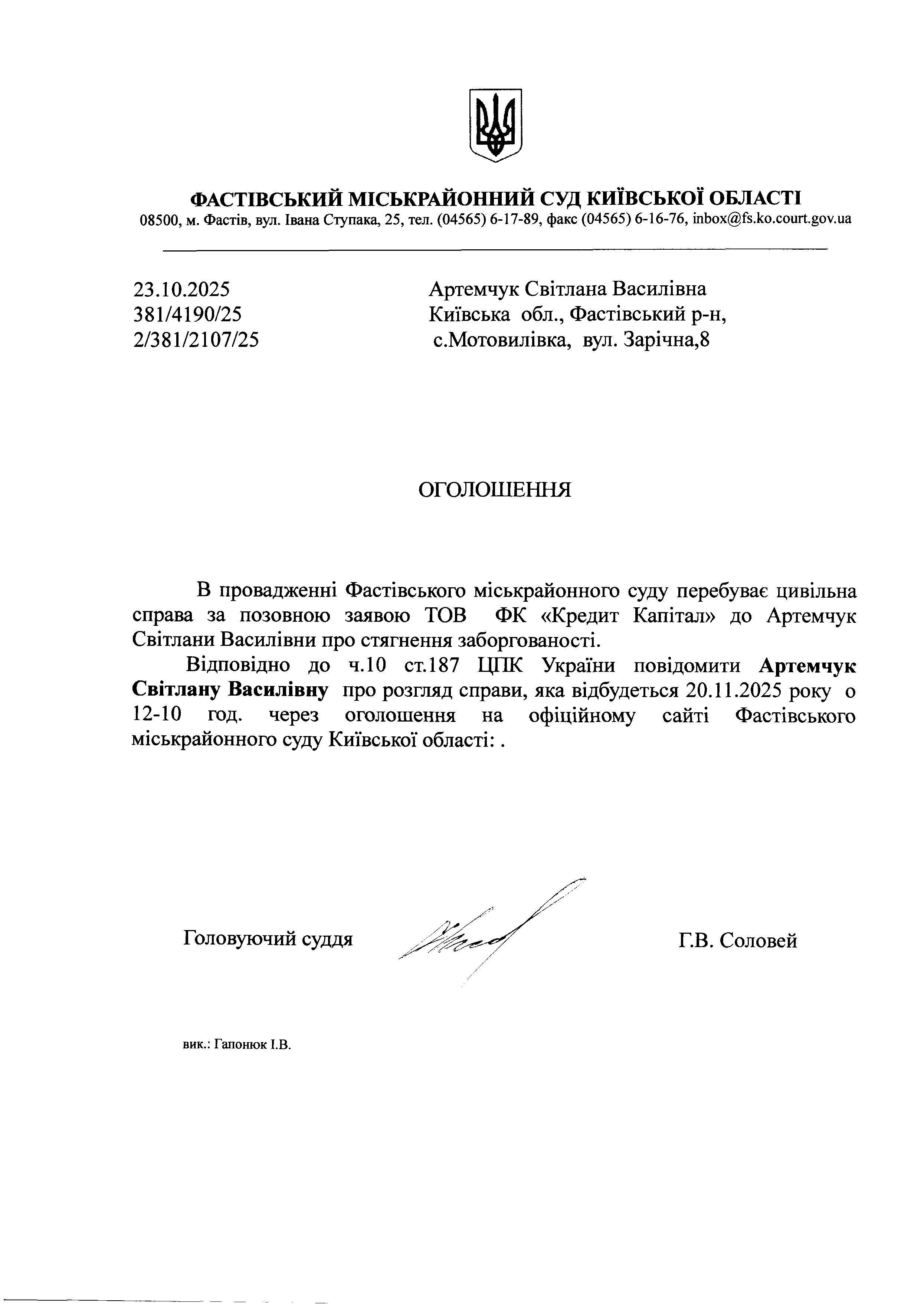 Артемчук Світлана Василівна Київська обл., Фастівський р-н, с.Мотовилівка, вул. Зарічна,8