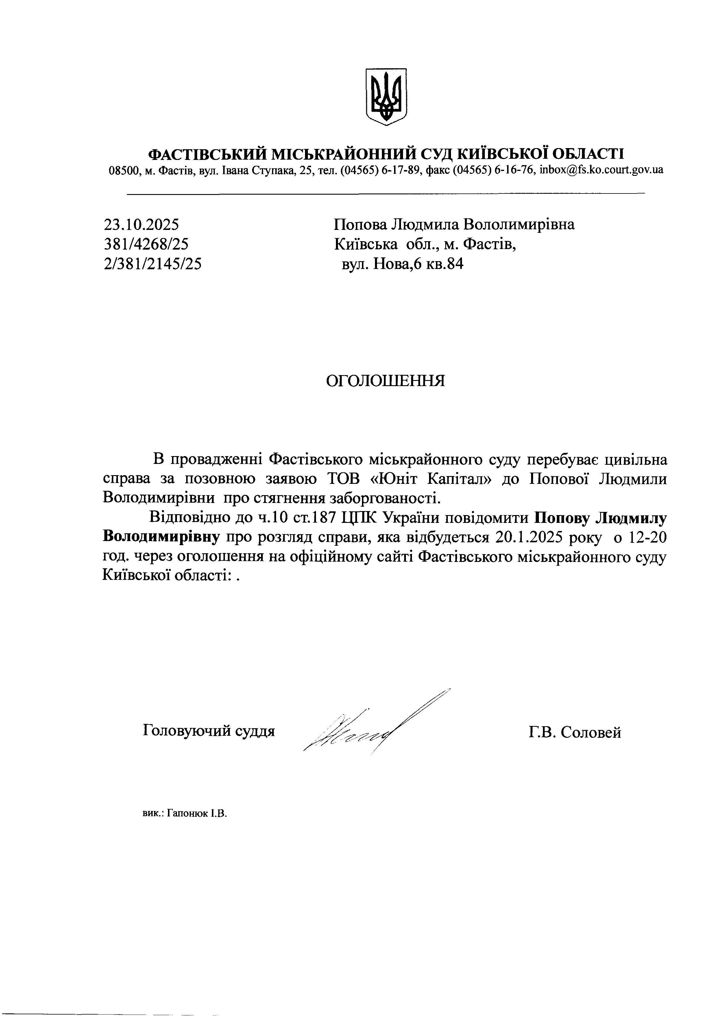 Попова Людмила Вололимирівна Київська обл., м. Фастів, вул. Нова,6 кв.84