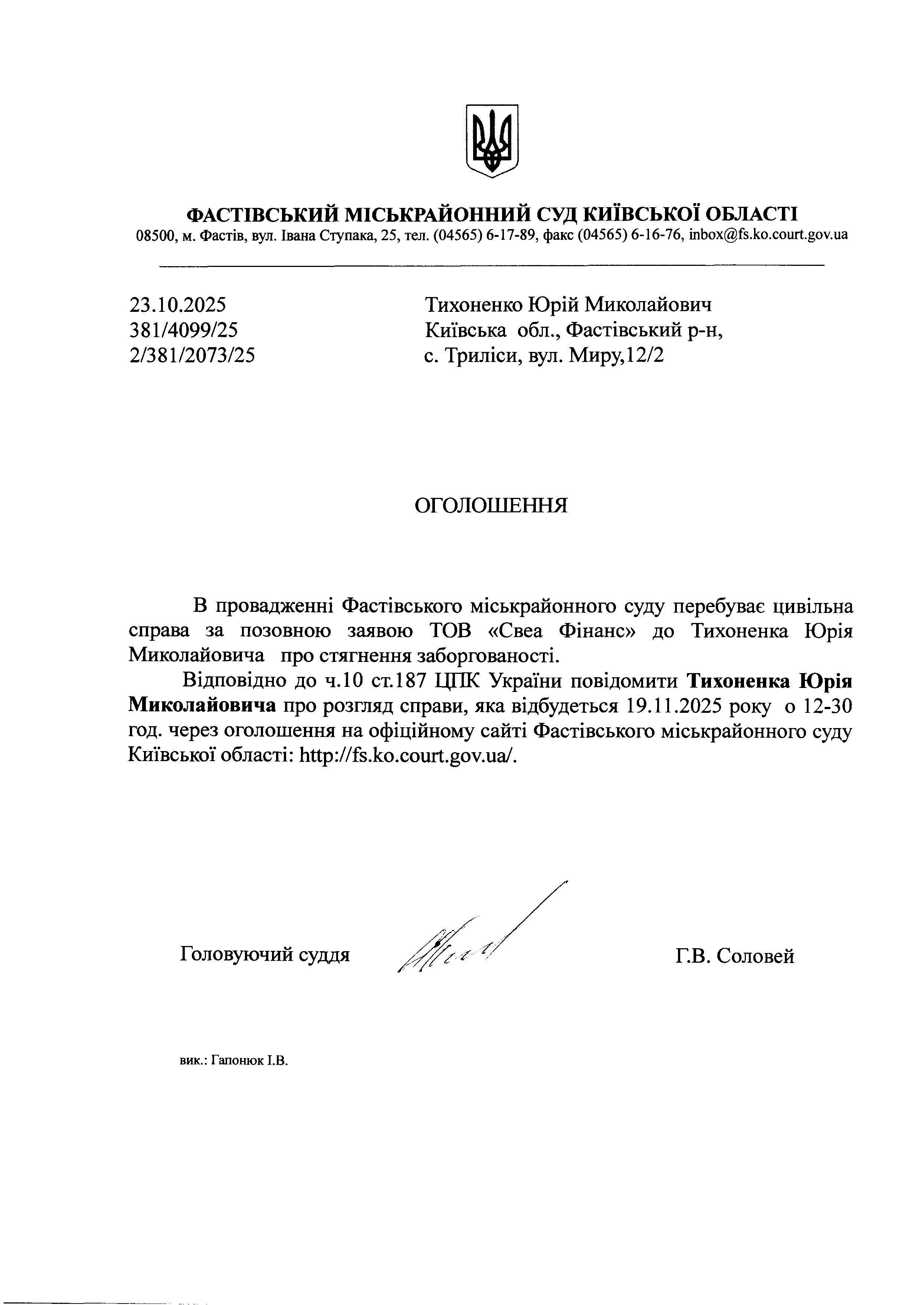 Тихоненко Юрій Миколайович Київська обл., Фастівський р-н, с. Триліси, вул. Миру, 12/2