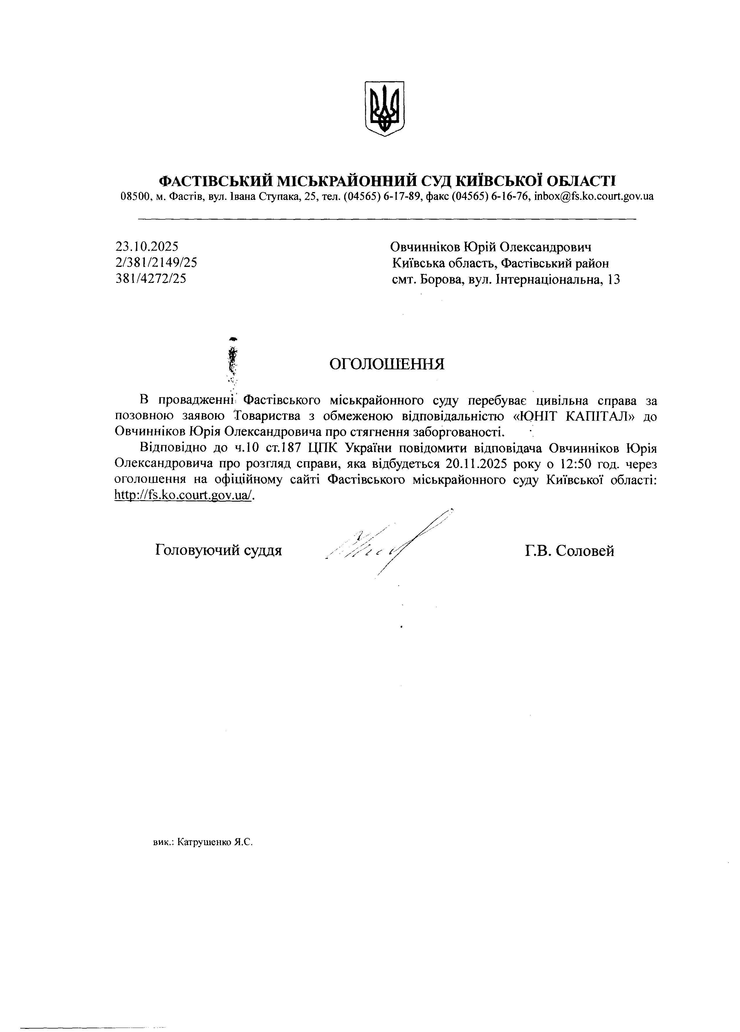 Овчинніков Юрій Олександрович Київська область, Фастівський район смт. Борова, вул. Інтернаціональна, 13