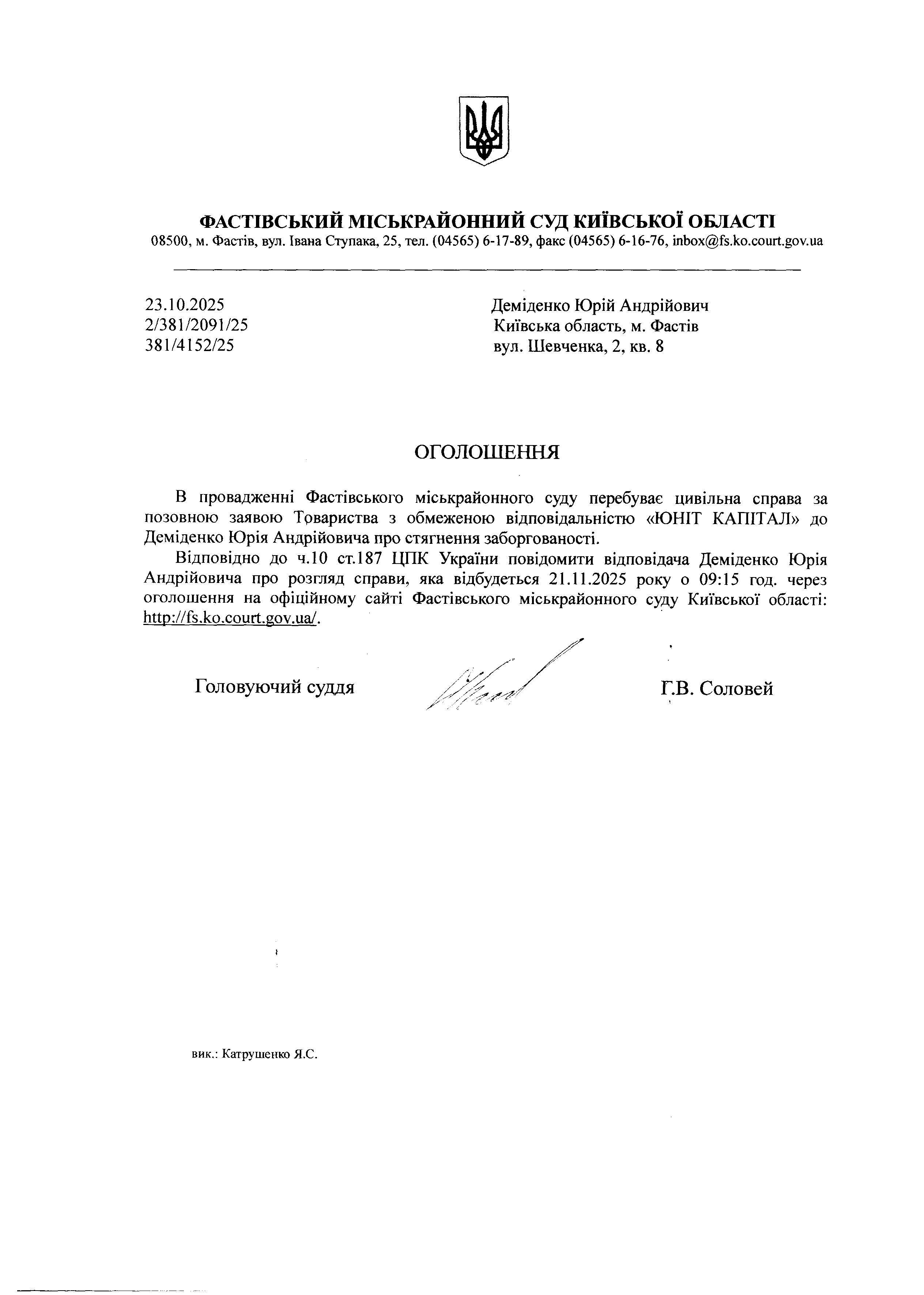 Деміденко Юрій Андрійович Київська область, м. Фастів вул. Шевченка, 2, кв. 8