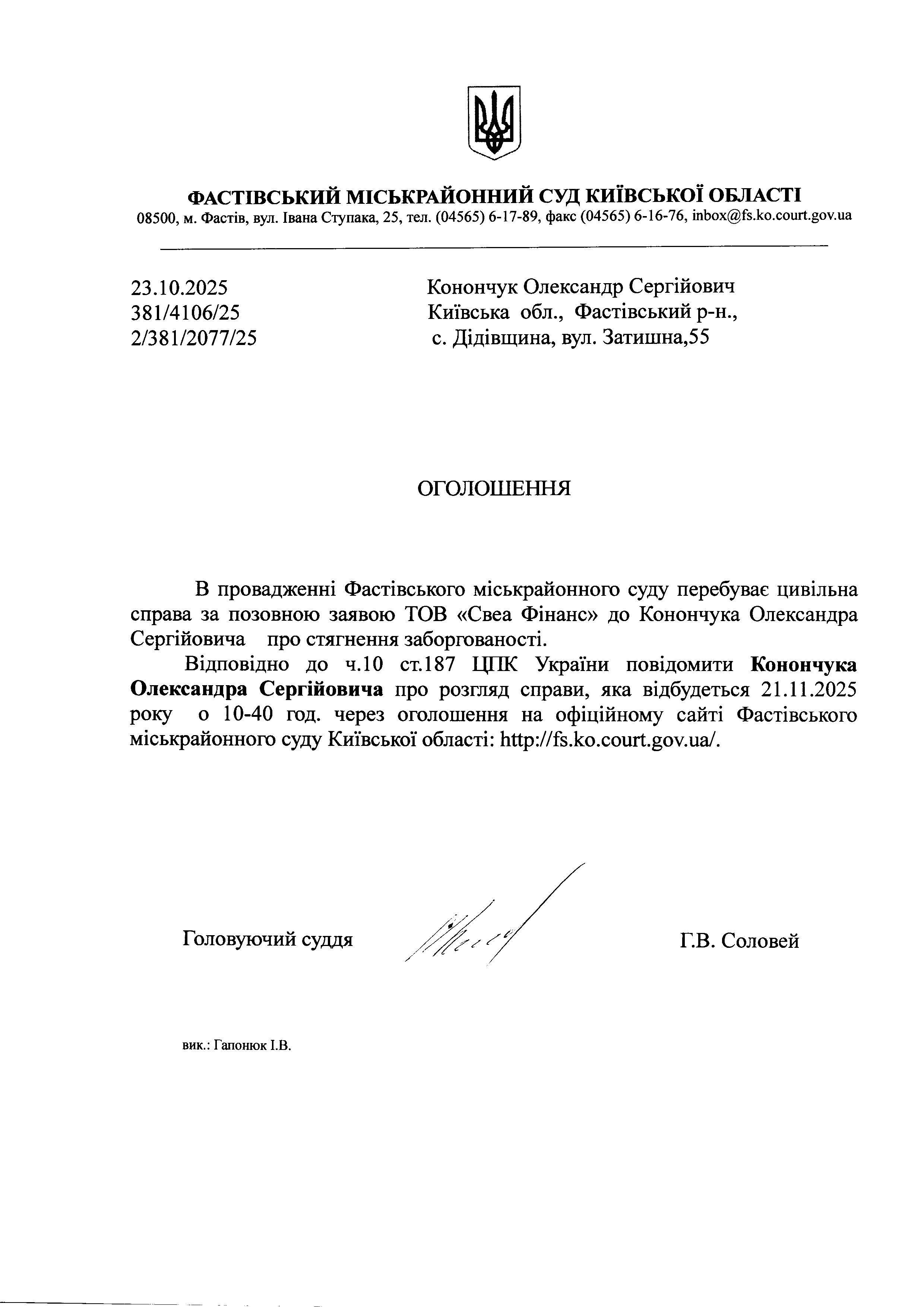 Конончук Олександр Сергійович Київська обл., Фастівський р-н., с. Дідівщина, вул. Затишна,55