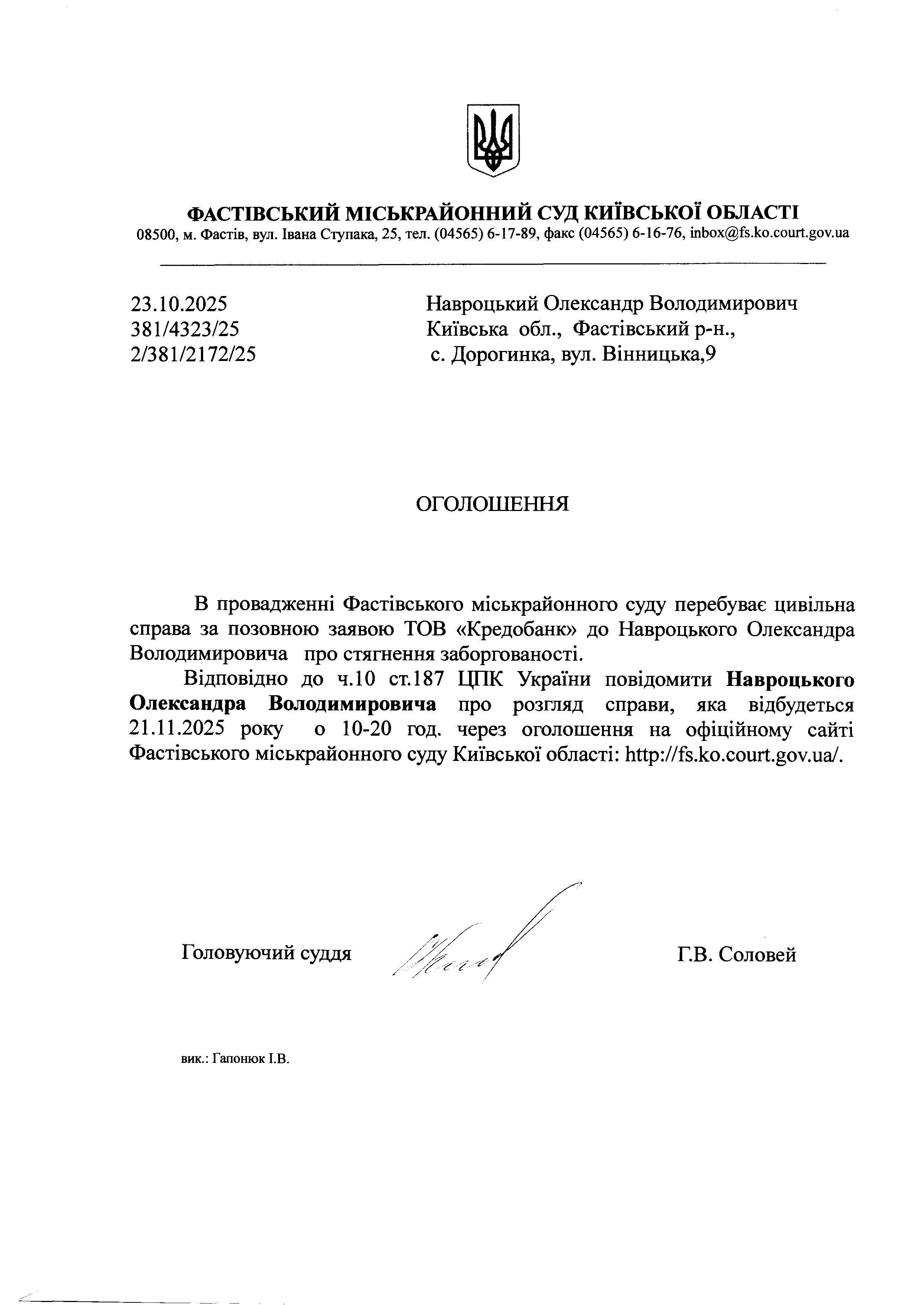 Навроцький Олександр Володимирович Київська обл., Фастівський р-н., с. Дорогинка, вул. Вінницька,9