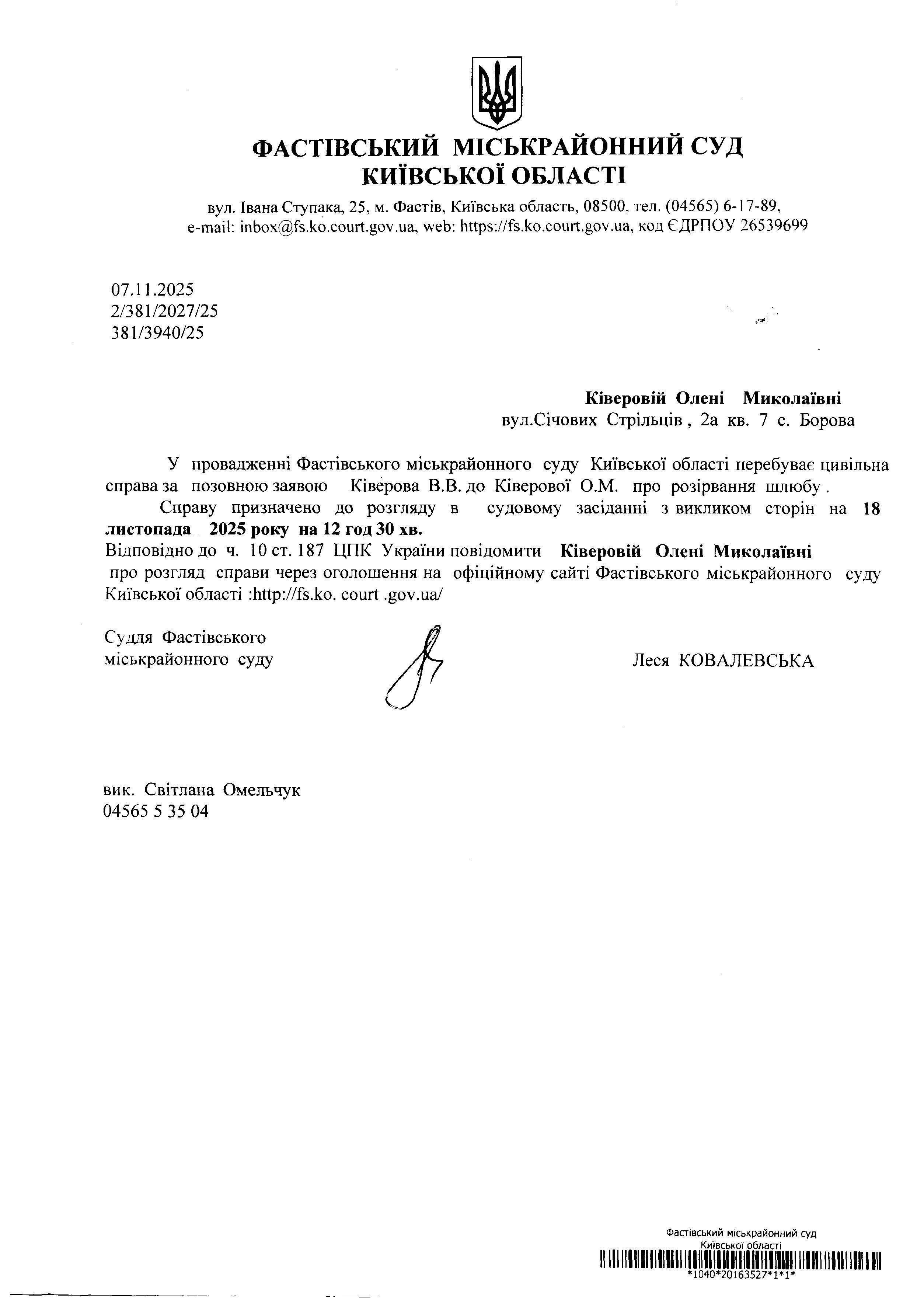 Ківеровій Олені Миколаївні вул.Січових Стрільців, 2а кв. 7 с. Борова