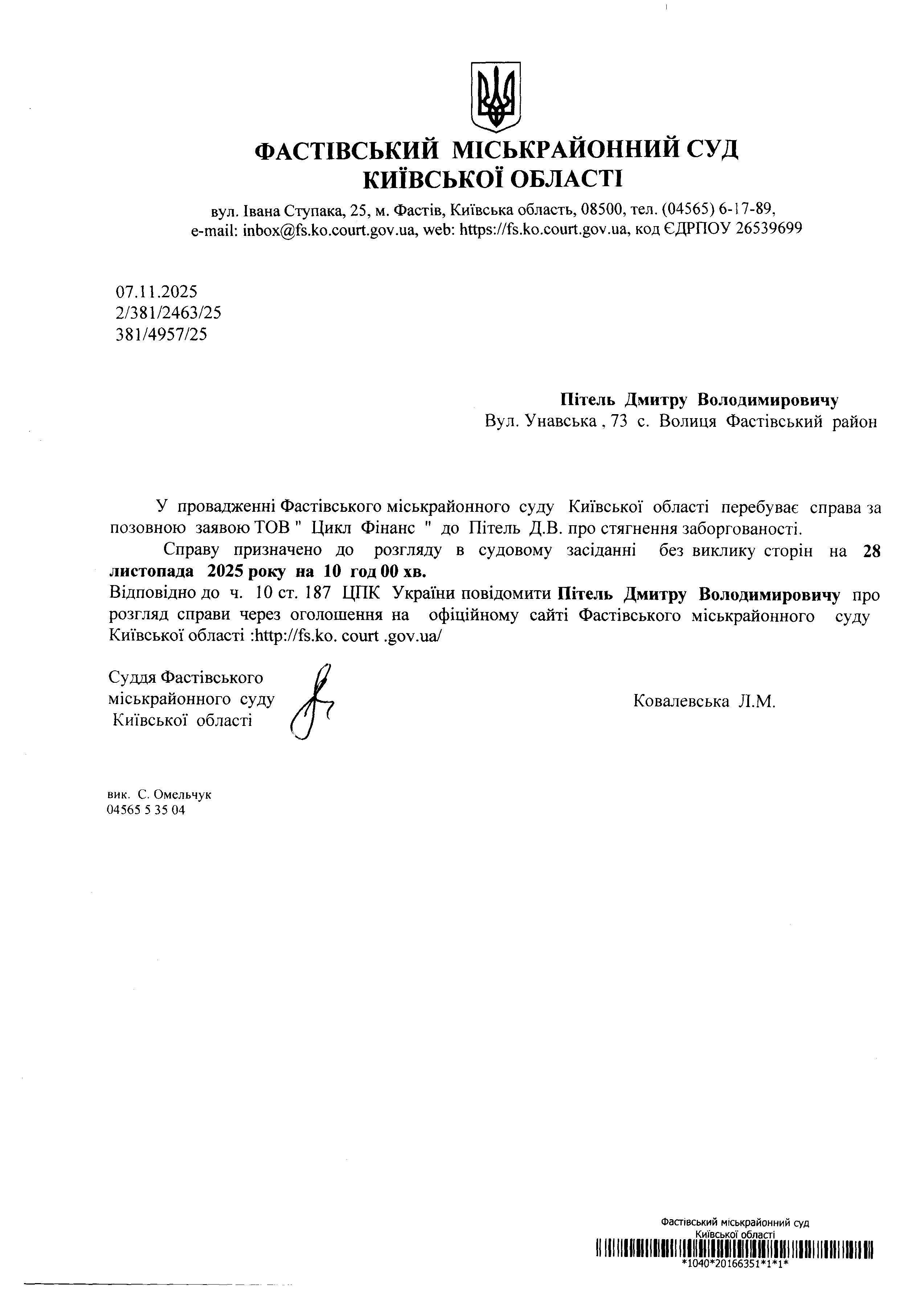 Пітель Дмитру Володимировичу Вул. Унавська, 73 с. Водиця Фастівський район