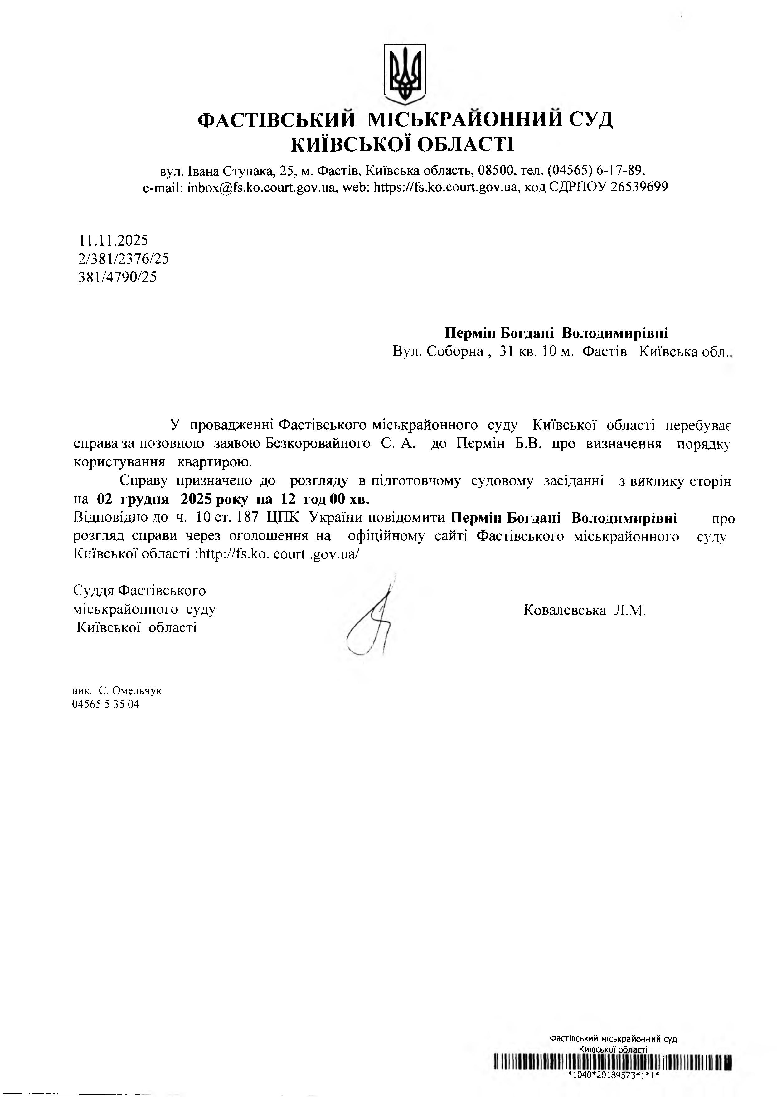 Пермін Богдані Володимирівні Вул. Соборна , 31 кв. 10 м. Фастів Київська обл..