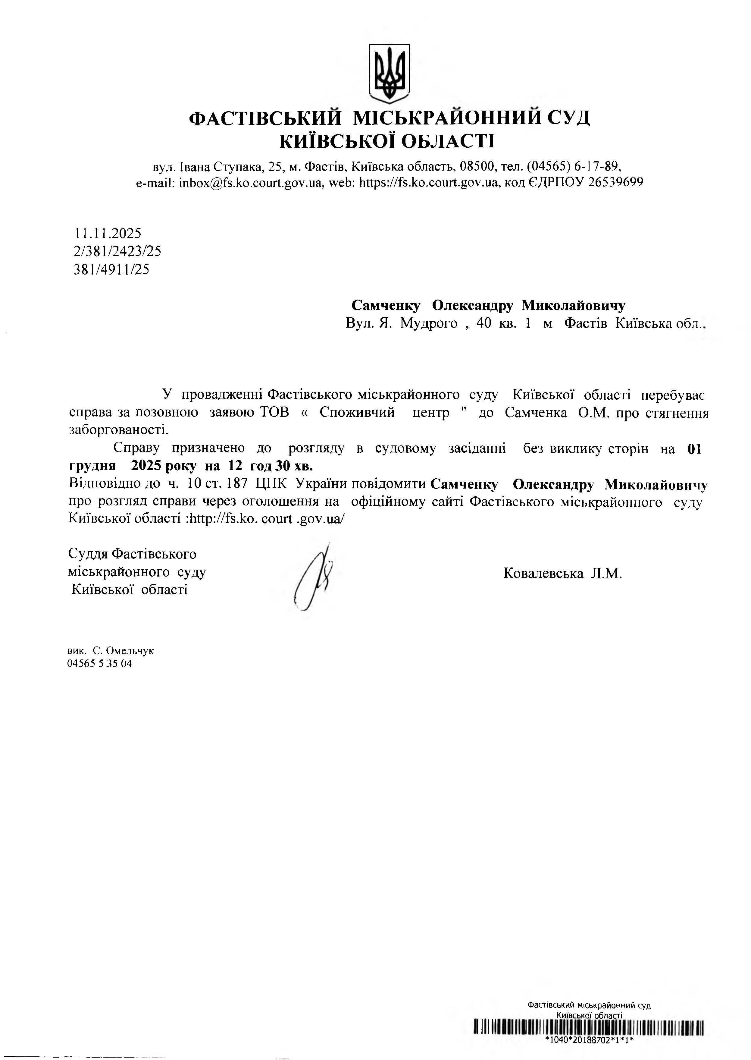 Самченку Олександру Миколайовичу Вул. Я. Мудрого , 40 кв. 1 м Фастів Київська обл..