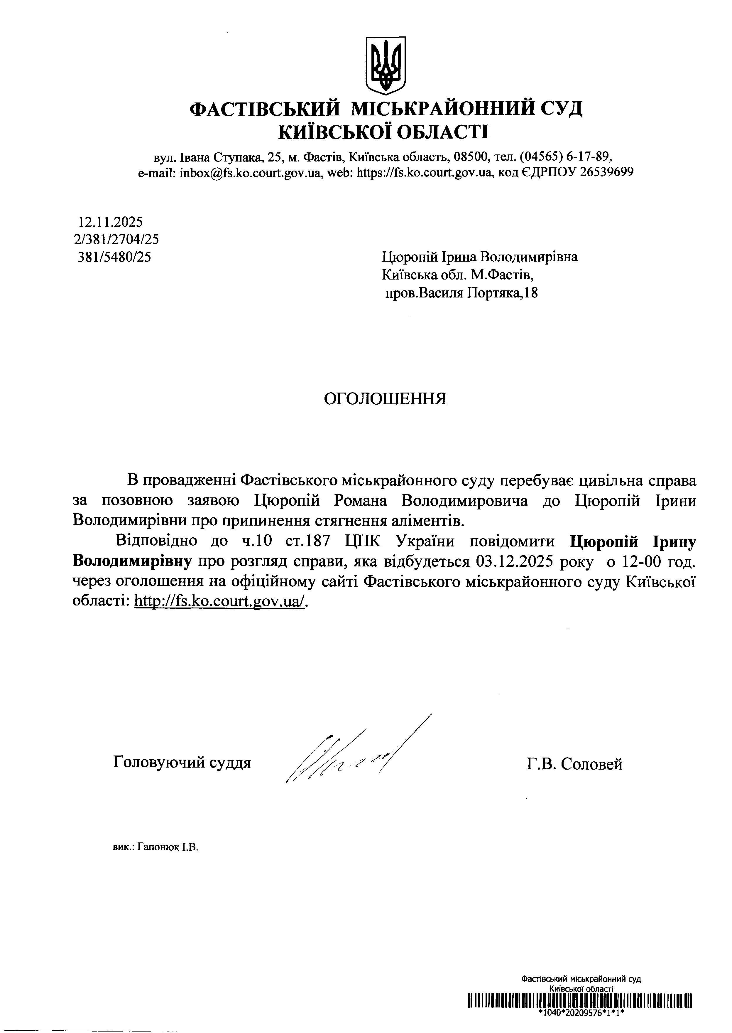Цюропій Ірина Володимирівна Київська обл. М.Фастів, пров.Василя Портяка,18