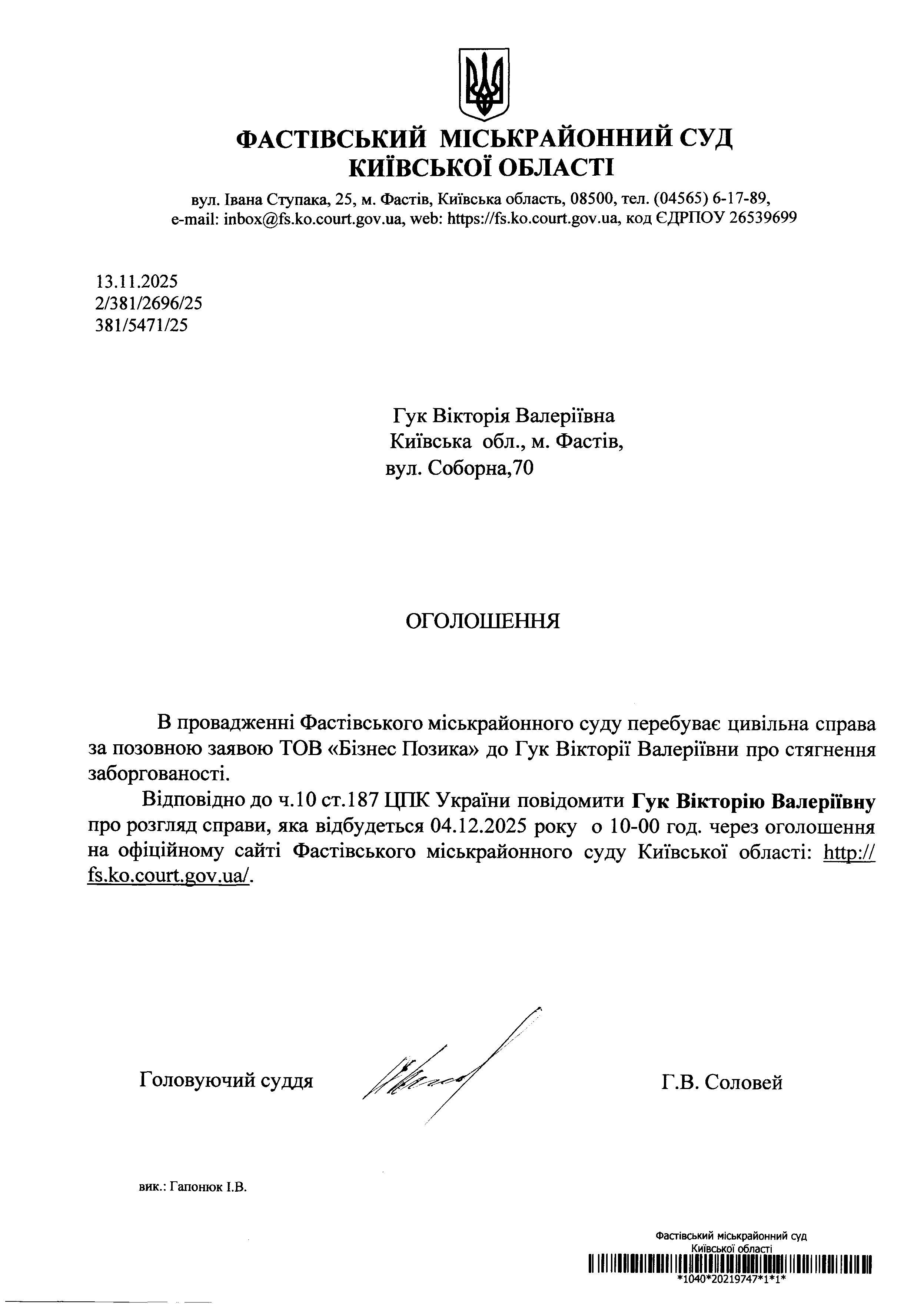 Гук Вікторія Валеріївна Київська обл., м. Фастів, вул. Соборна,70