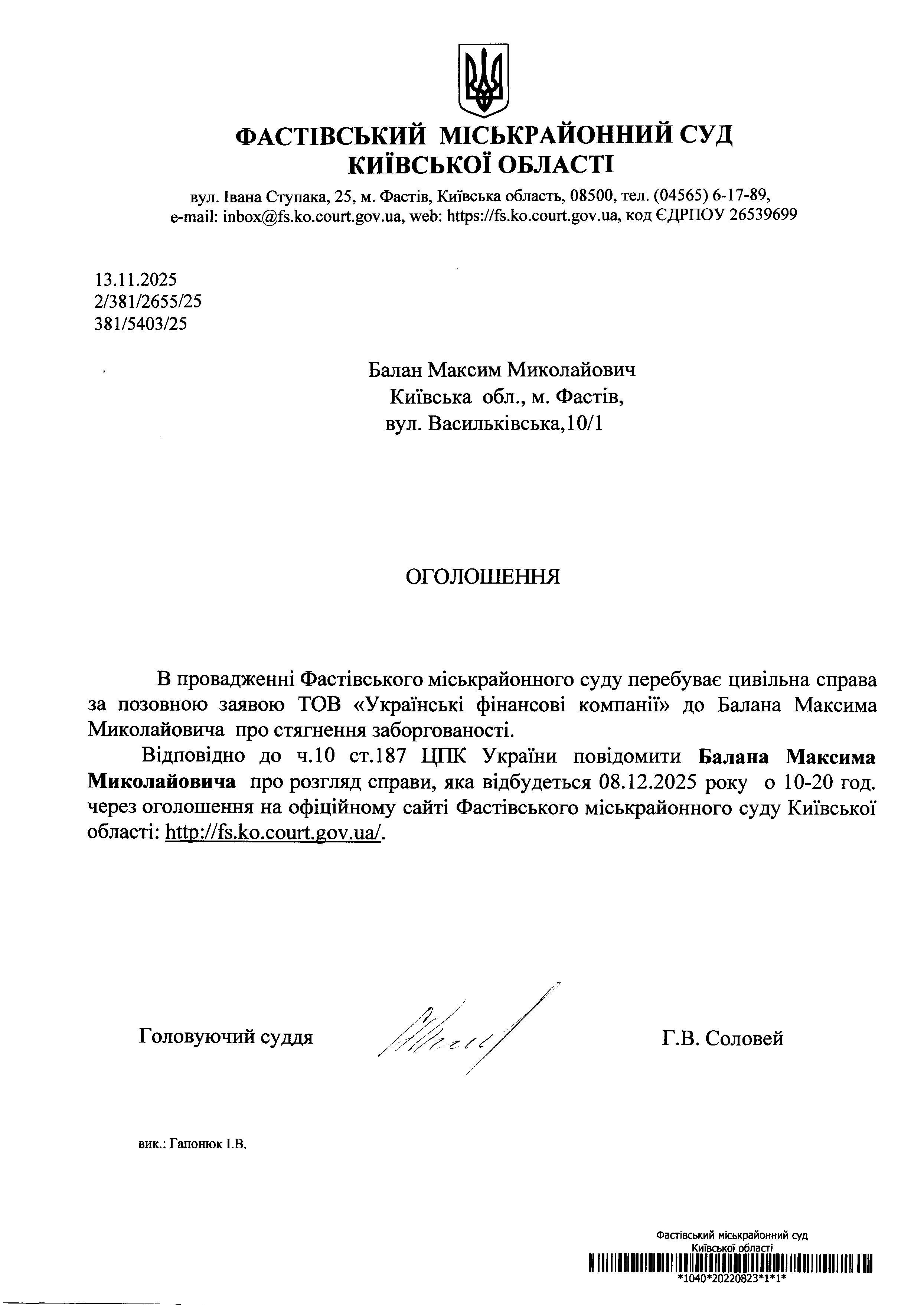 Балан Максим Миколайович Київська обл., м. Фастів, вул. Васильківська, 10/1