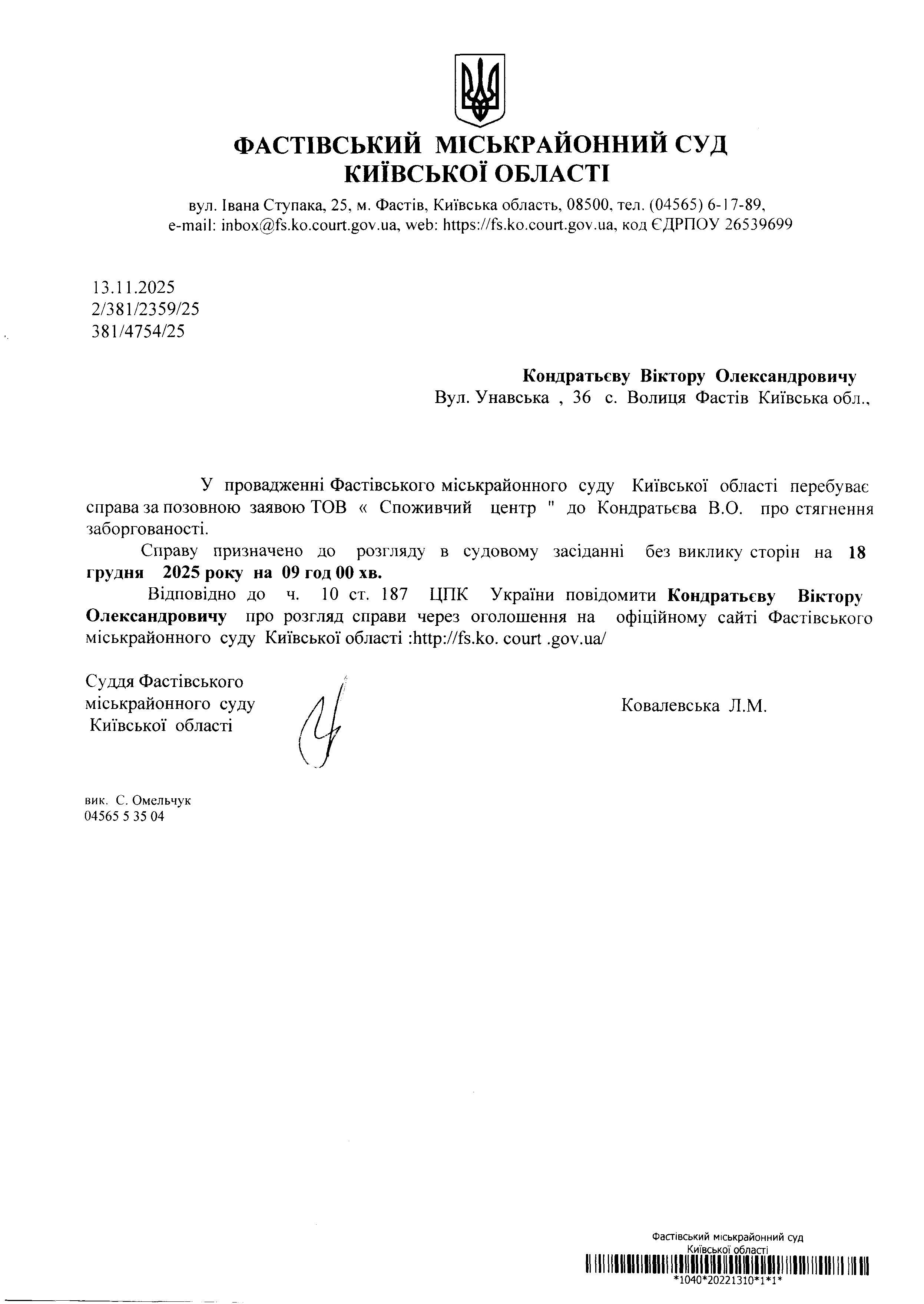 Кондратьеву Віктору Олександровичу Вул. Унавська , 36 с. Водиця Фастів Київська обл..