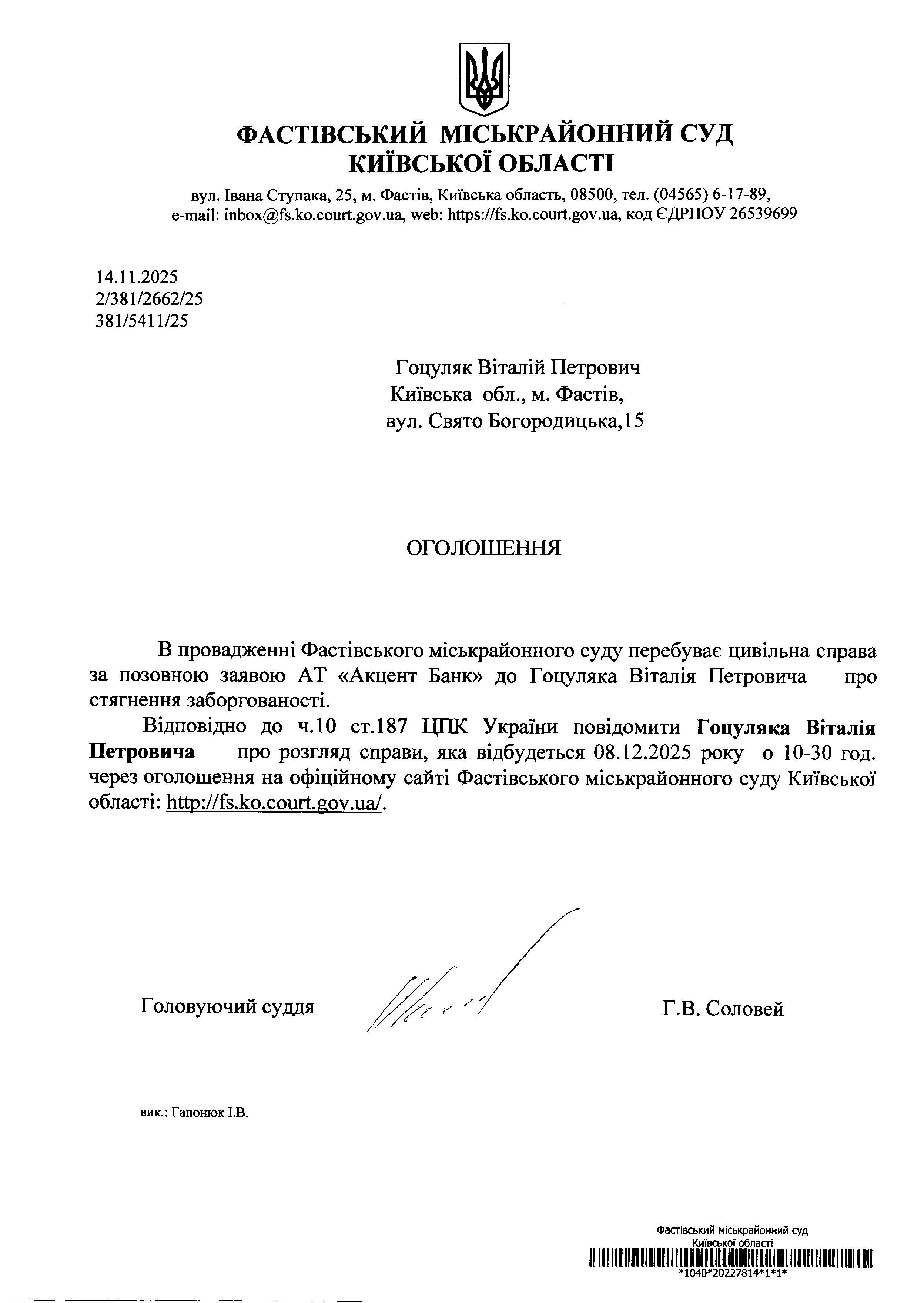 Гоцуляк Віталій Петрович Київська обл., м. Фастів, вул. Свято Богородицька, 15