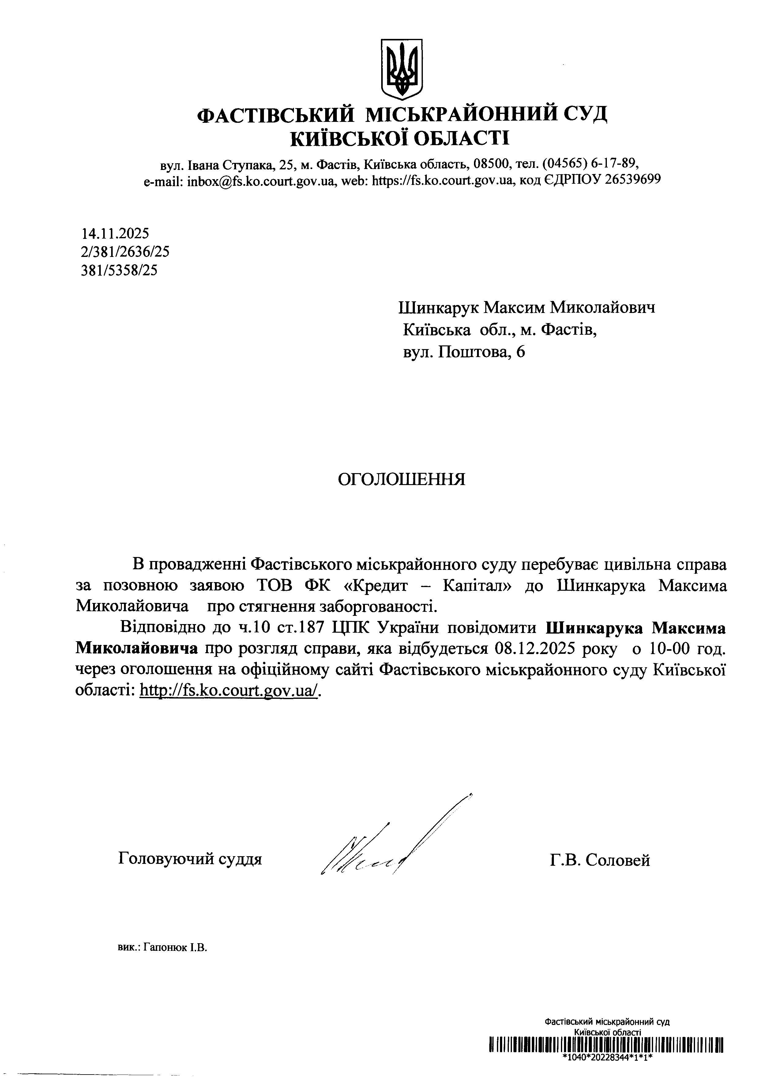Шинкарук Максим Миколайович Київська обл., м. Фастів, вул. Поштова, 6