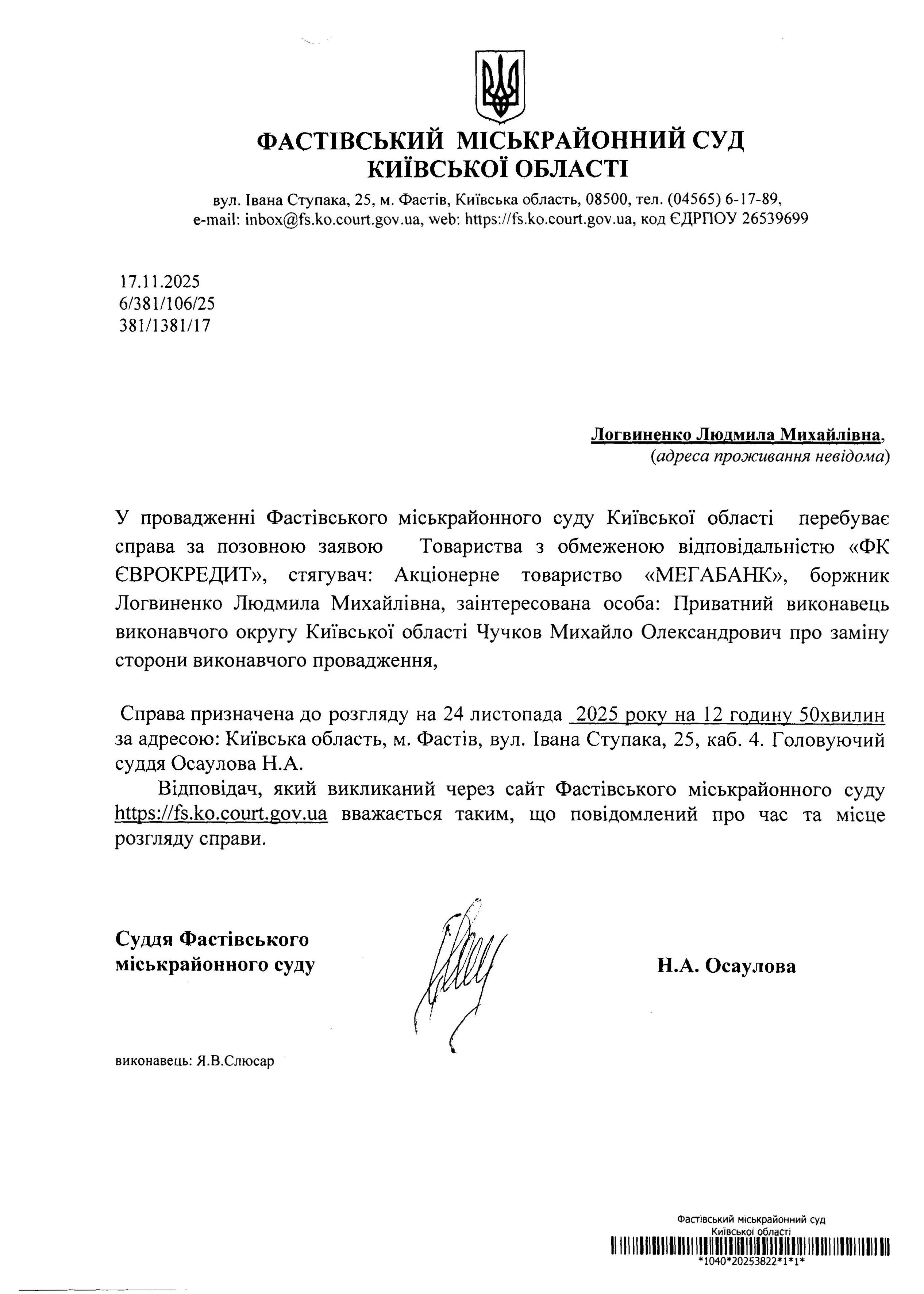 Логвиненко Людмила Михайлівна. (іадреса проживання невідома)