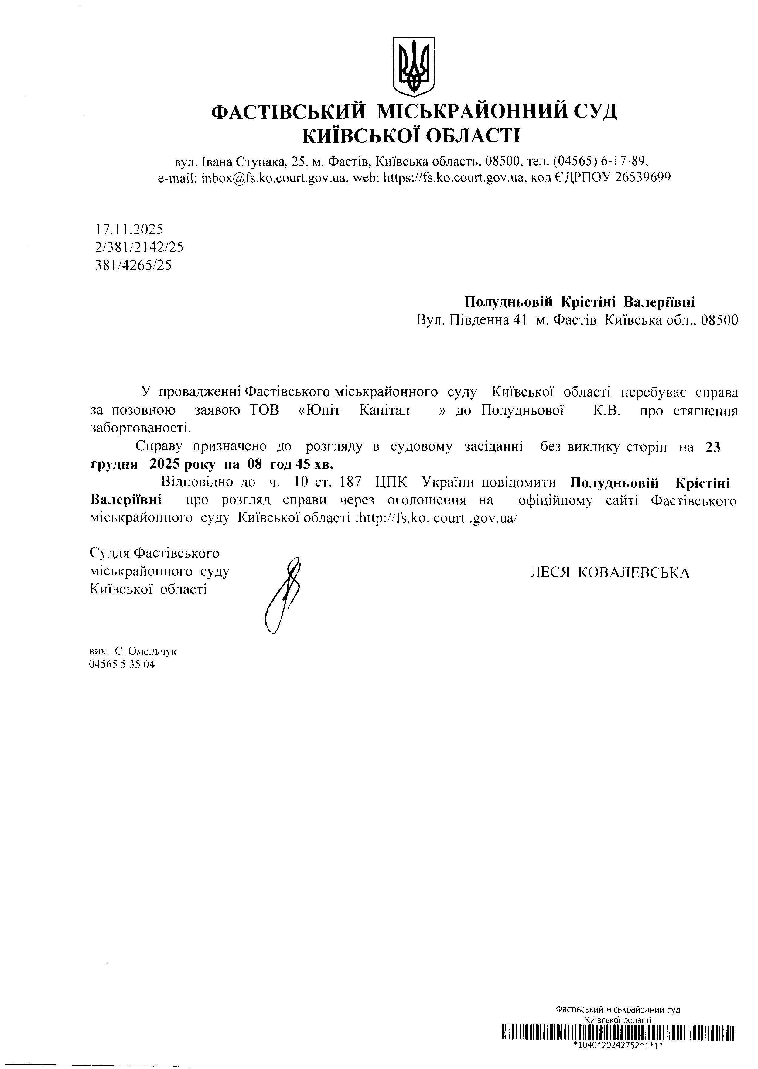 Полудньовій Крістіні Валеріївні Вул. Південна 41 м. Фастів Київська обл.. 08500