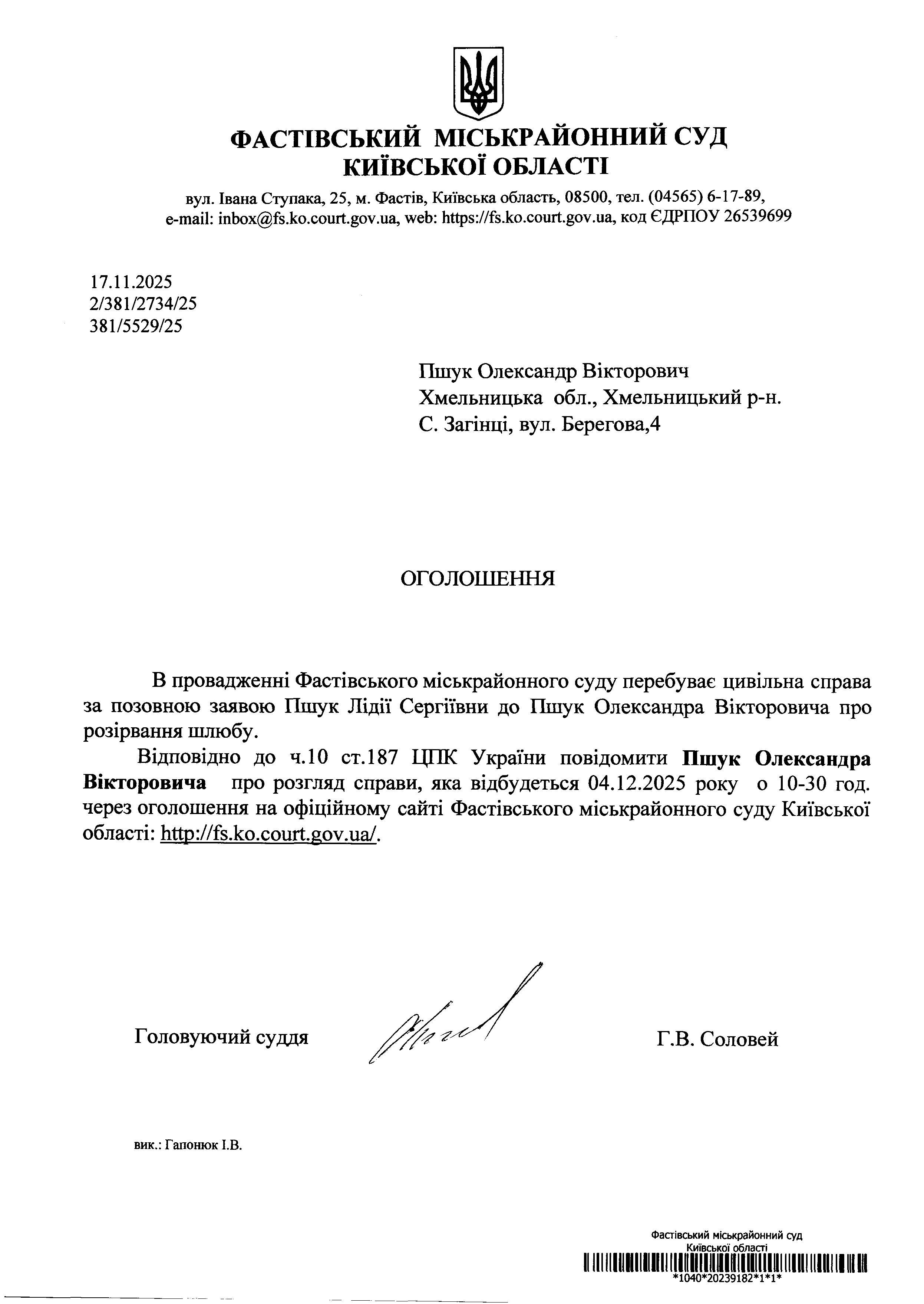 Пшук Олександр Вікторович Хмельницька обл., Хмельницький р-н. С. Загінці, вул. Берегова,4