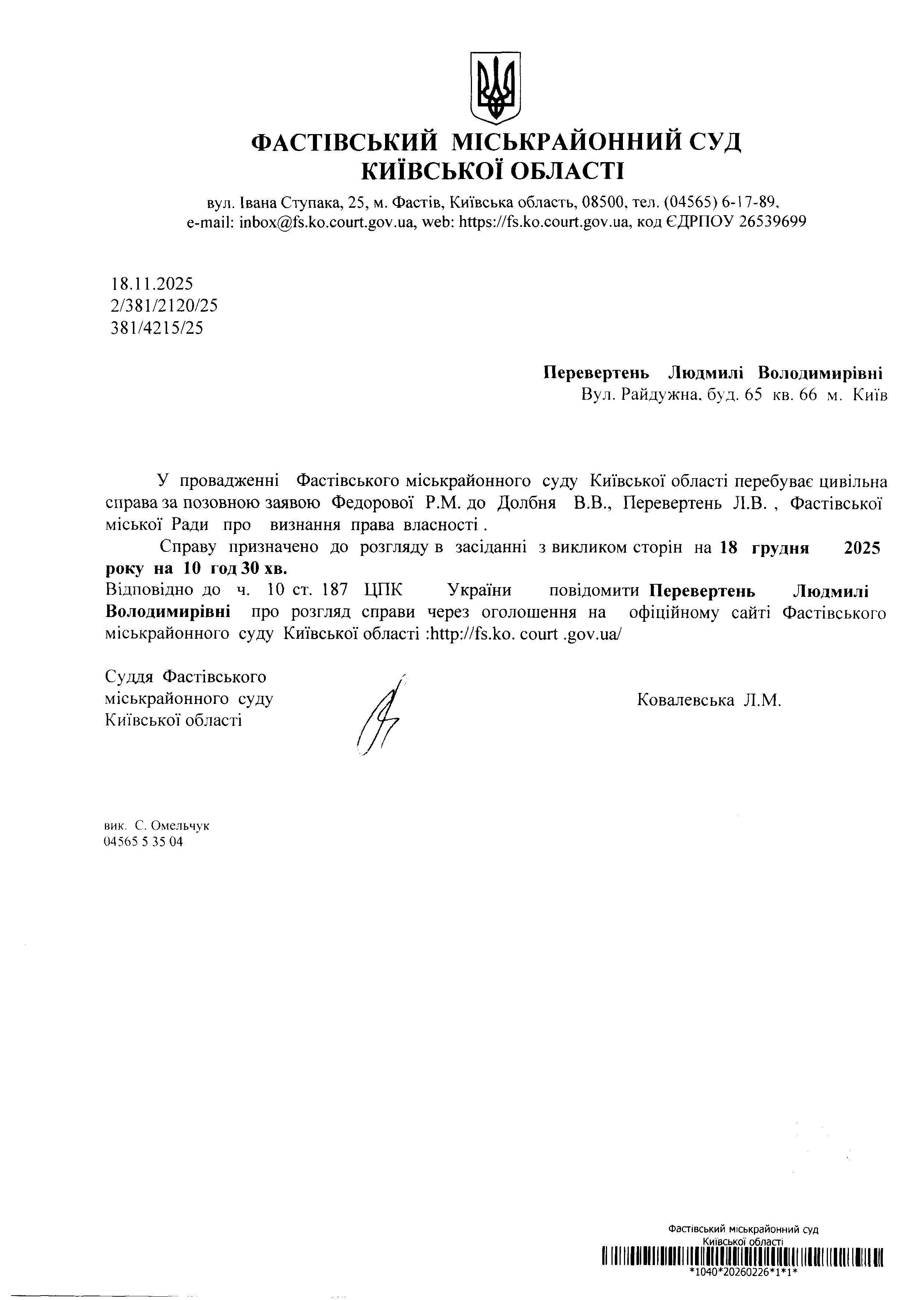 Перевертень Людмилі Володимирівні Вул. Райдужна, буд. 65 кв. 66 м. Київ