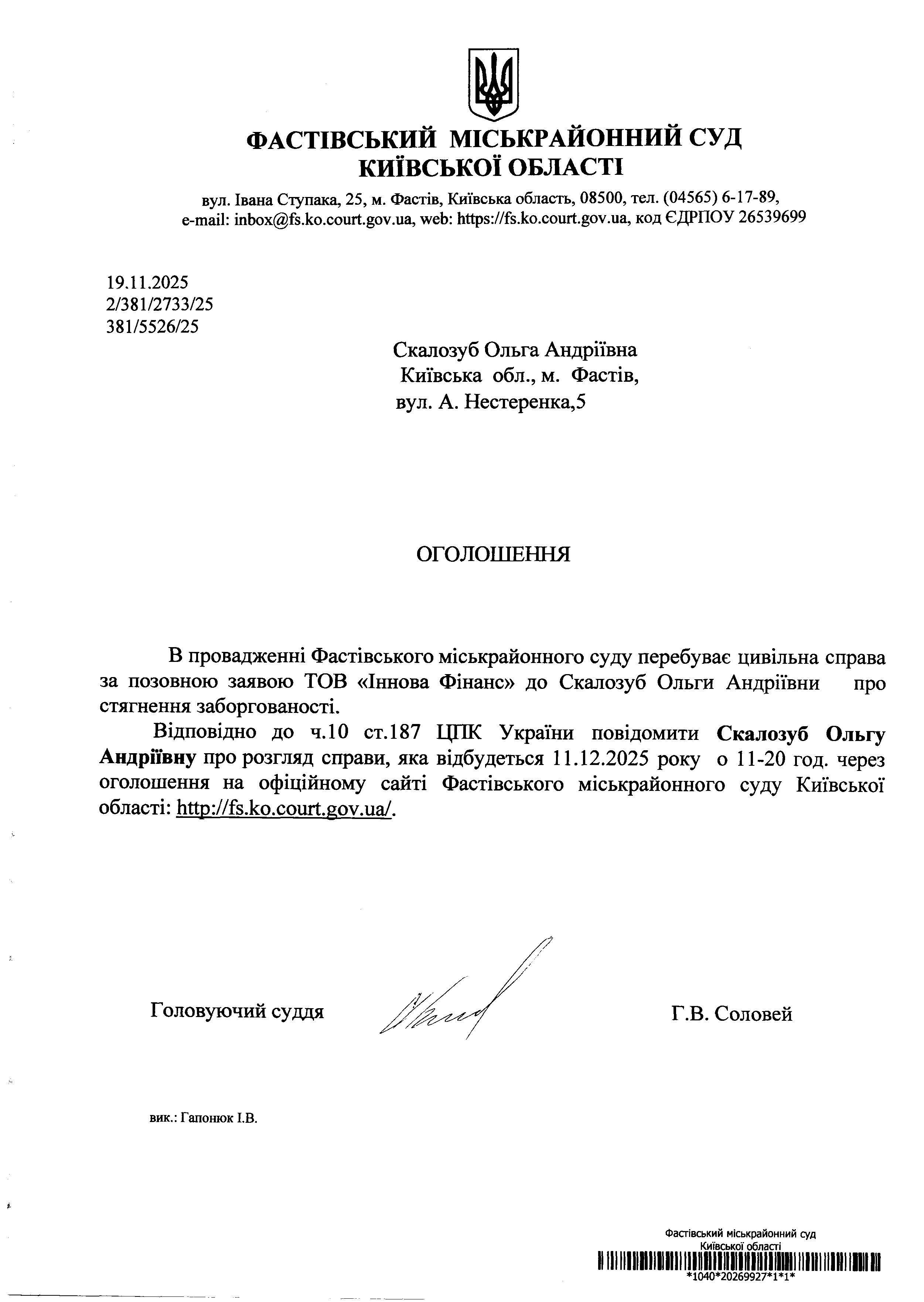 Скалозуб Ольга Андріївна Київська обл., м. Фастів, вул. А. Нестеренка,5