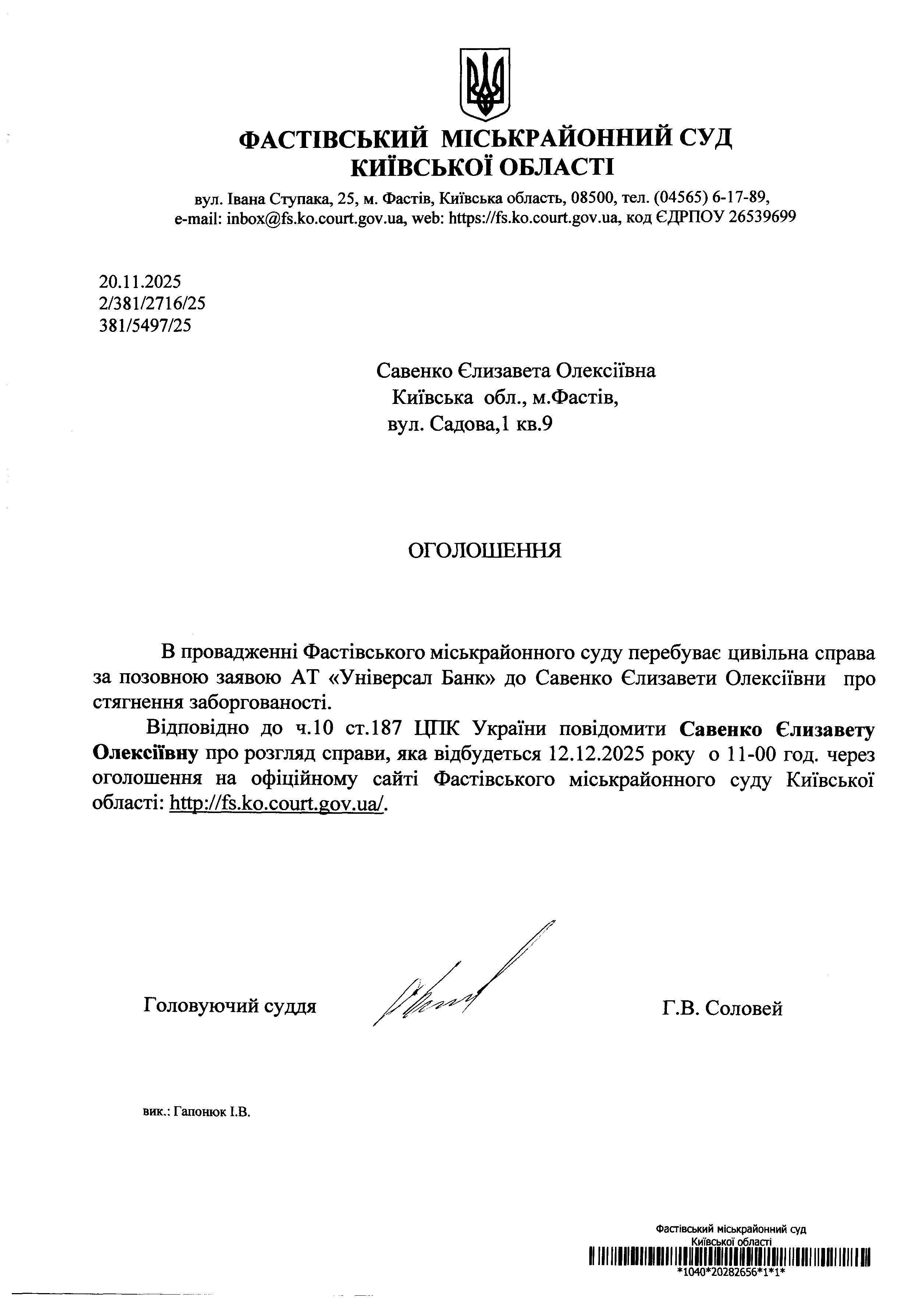 Савенко Єлизавета Олексіївна Київська обл., м.Фастів, вул. Садова,! кв.9