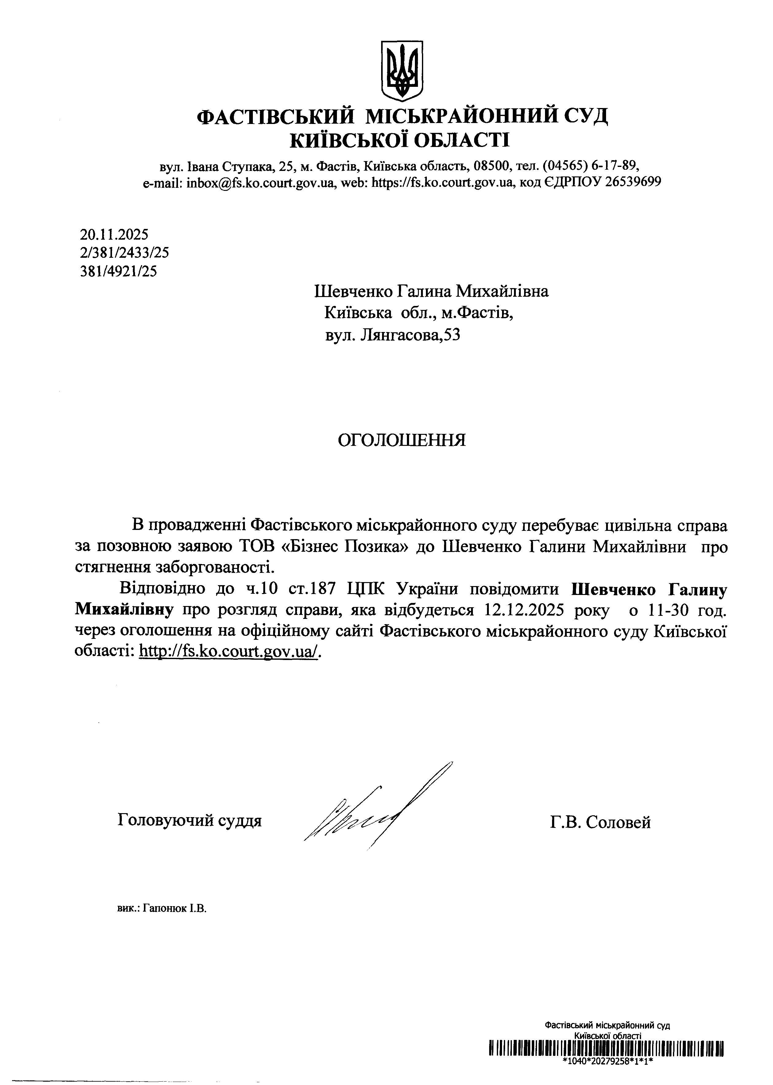 Шевченко Г алина Михайлівна Київська обл., м.Фастів, вул. Лянгасова,53