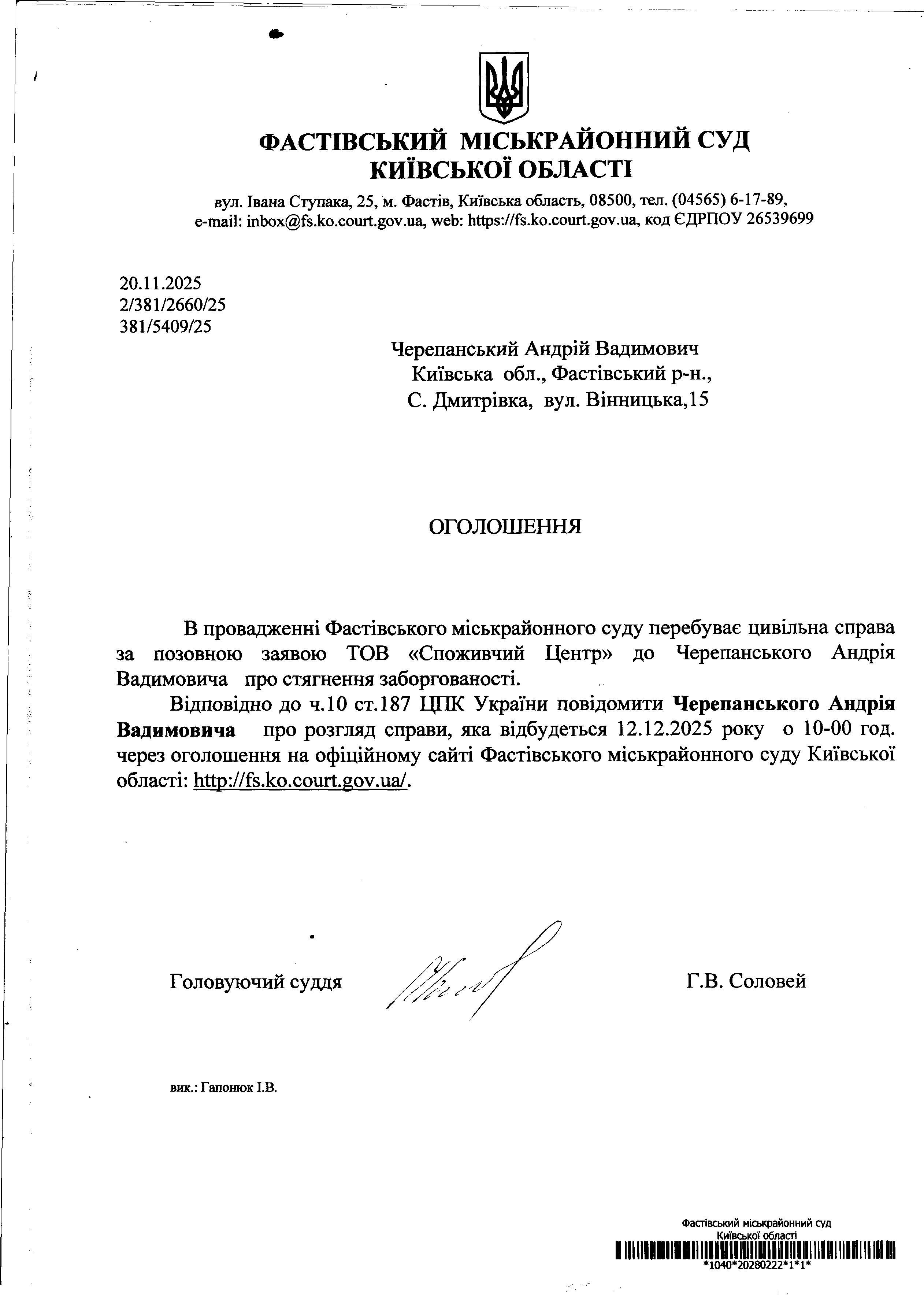 Черепанський Андрій Вадимович Київська обл., Фастівський р-н., С. Дмитрівка, вул. Вінницька, 15
