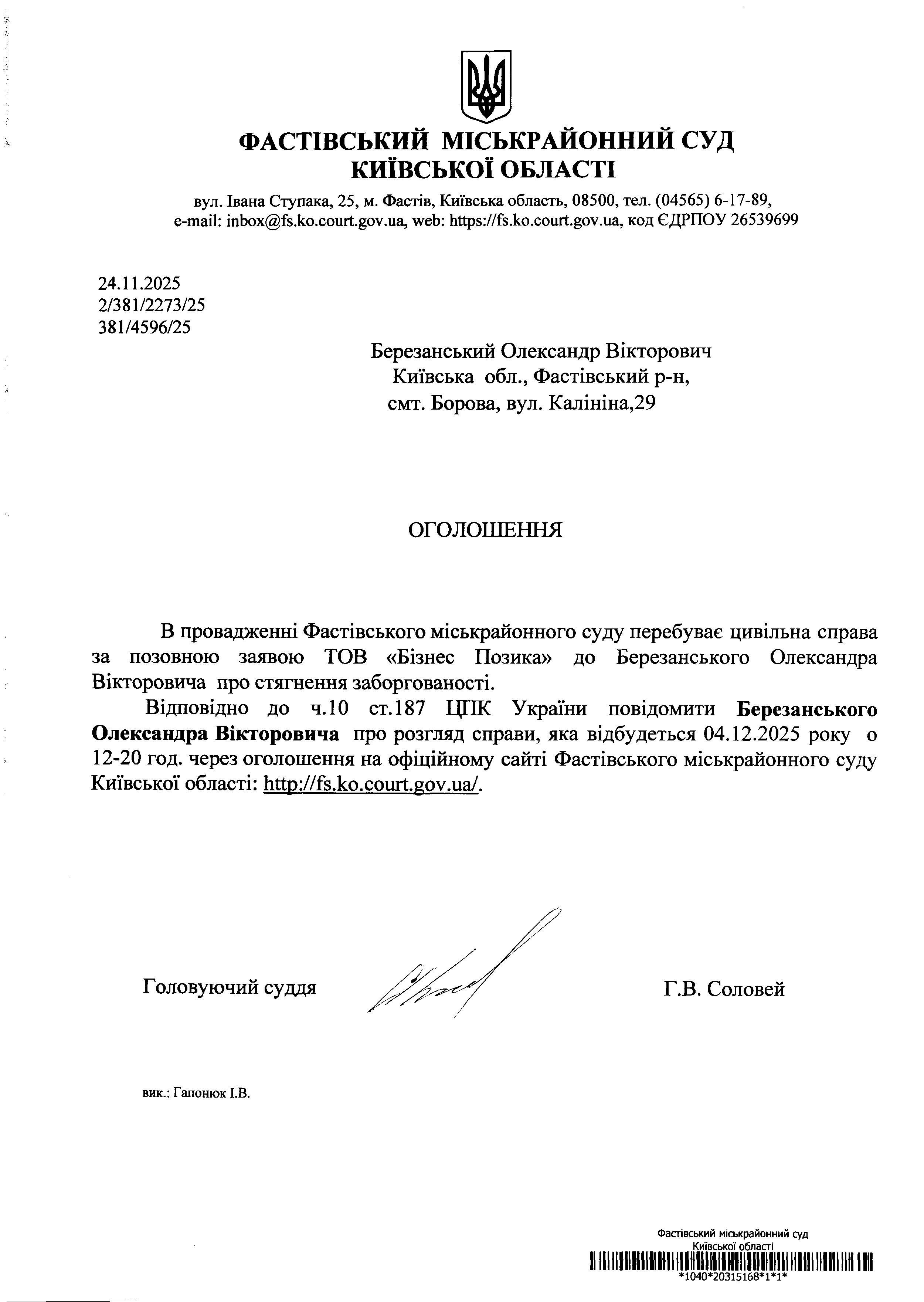 Березанський Олександр Вікторович Київська обл., Фастівський р-н, смт. Борова, вул. Калініна,29