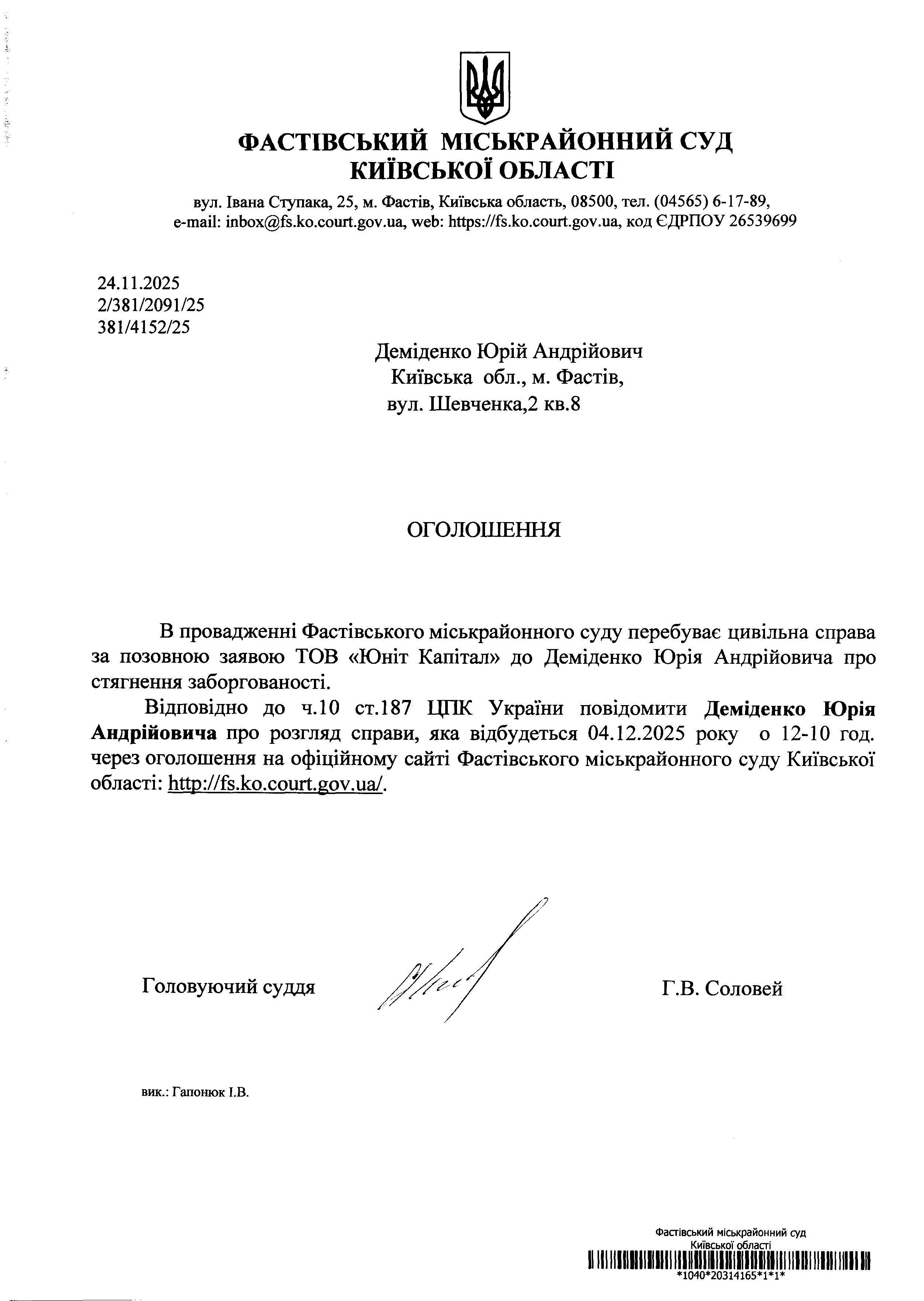 Деміденко Юрій Андрійович Київська обл., м. Фастів, вул. Шевченка,2 кв.8