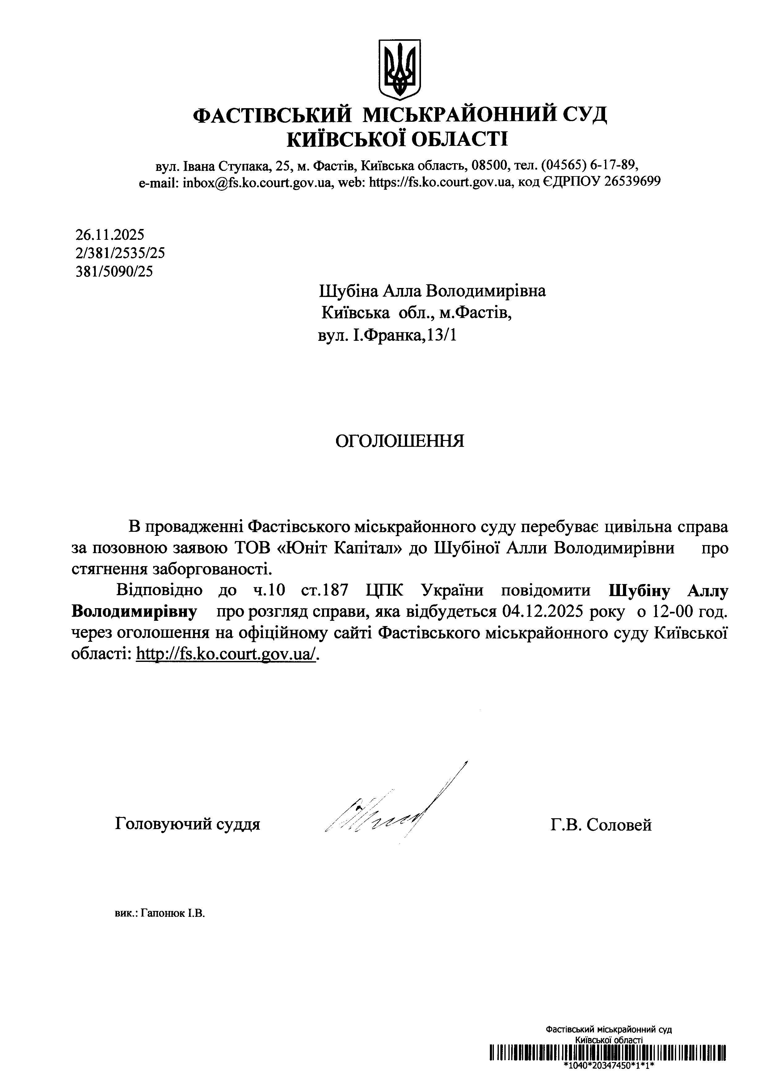 Шубіна Алла Володимирівна Київська обл., м.Фастів, вул. І.ФранкаДЗ/1