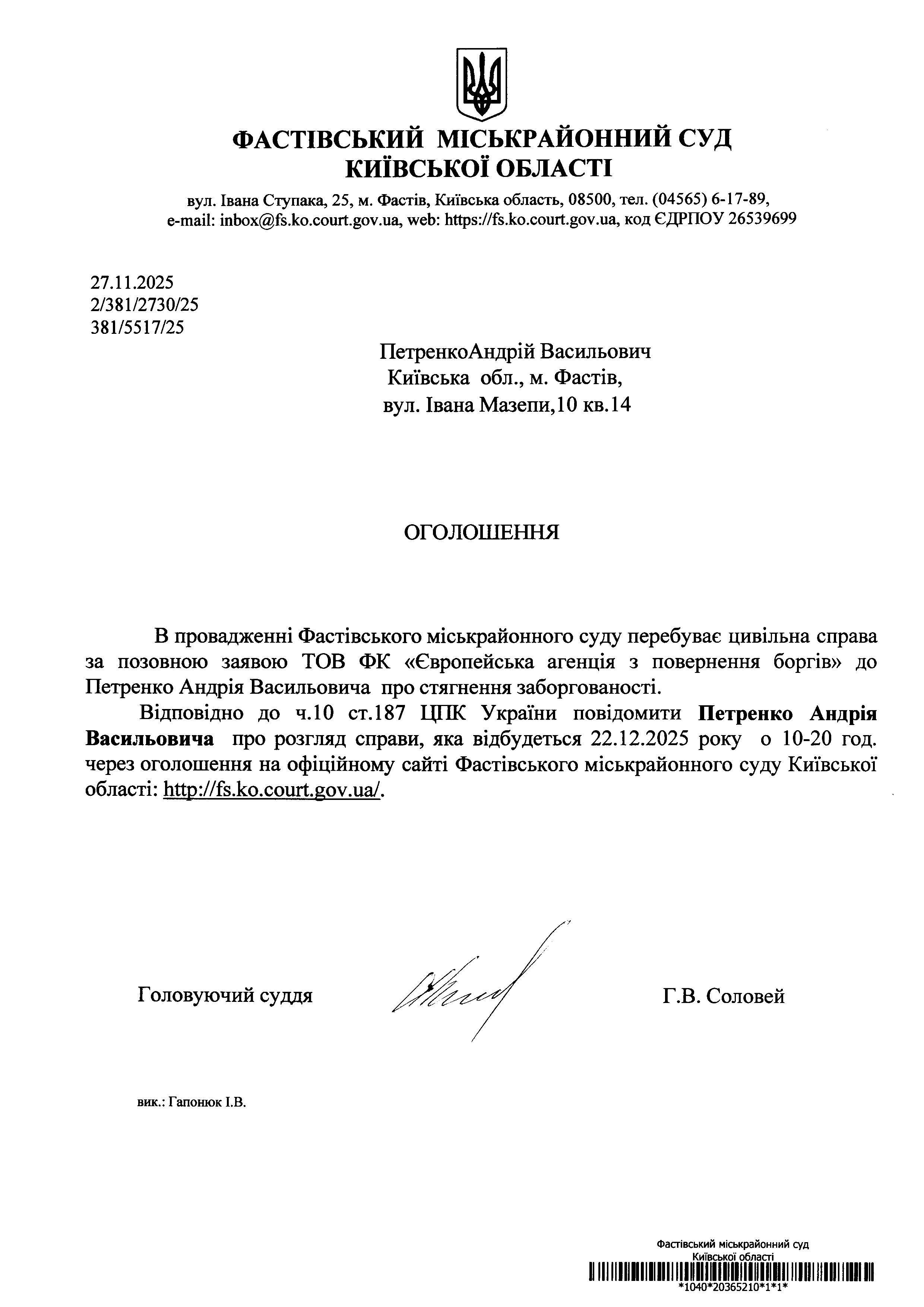 ПетренкоАндрій Васильович Київська обл., м. Фастів, вул. Івана Мазепи, 10 кв.14