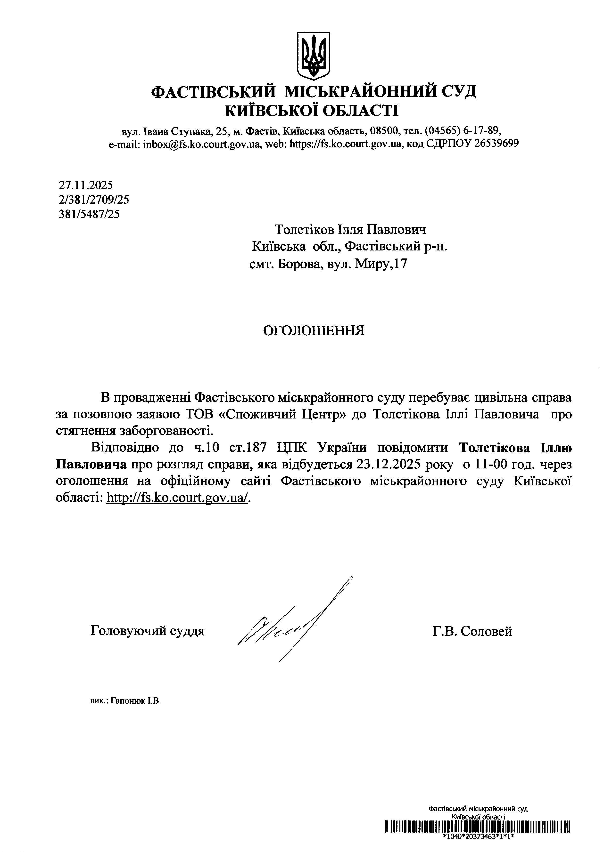 Толстіков Ілля Павлович Київська обл., Фастівський р-н. смт. Борова, вул. Миру, 17