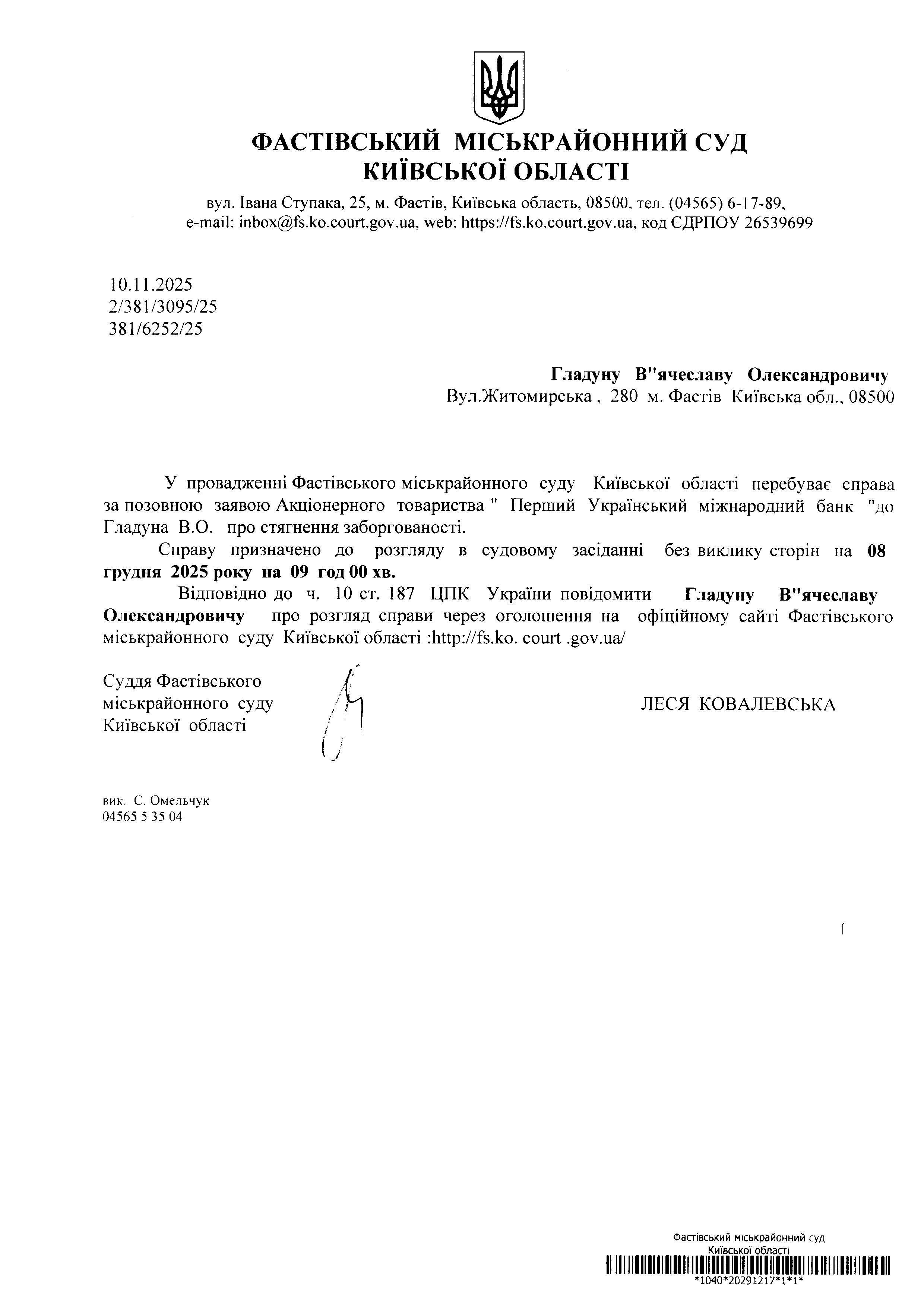 Гладуну В"ячеславу Олександровичу Вул.Житомирська , 280 м. Фастів Київська обл., 08500