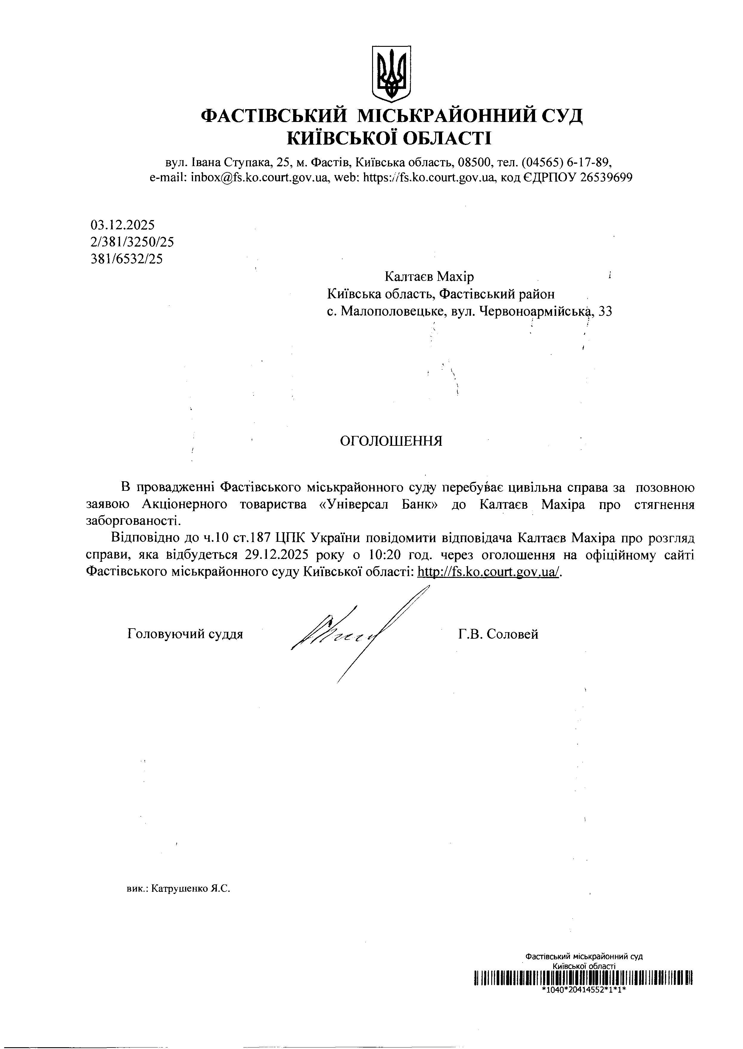 Калтаєв Махір •’ Київська область, Фастівський район с. Малополовецьке, вул. Червоноармійська, 33