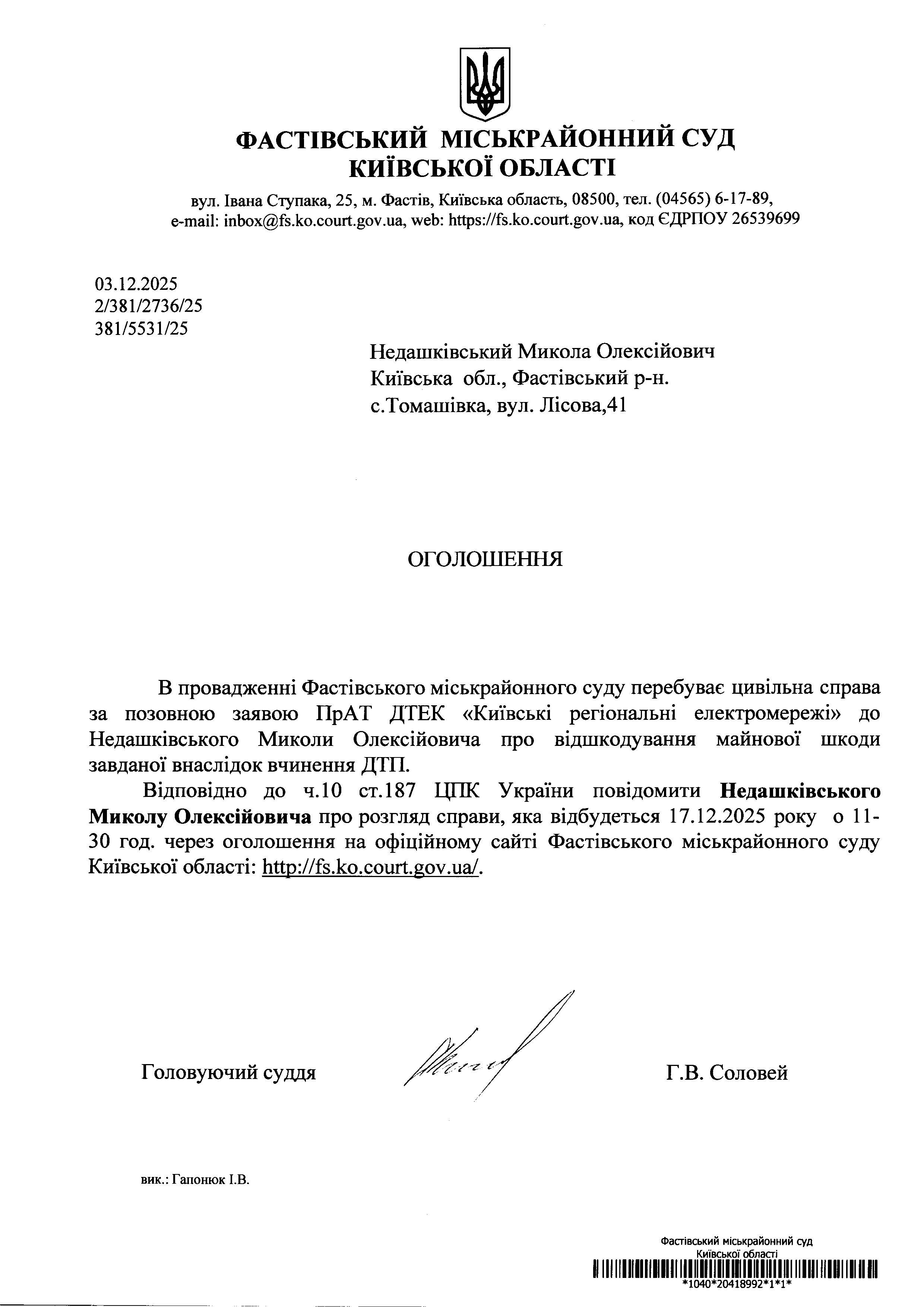 Недашківський Микола Олексійович Київська обл., Фастівський р-н. с.Томашівка, вул. Лісова,41