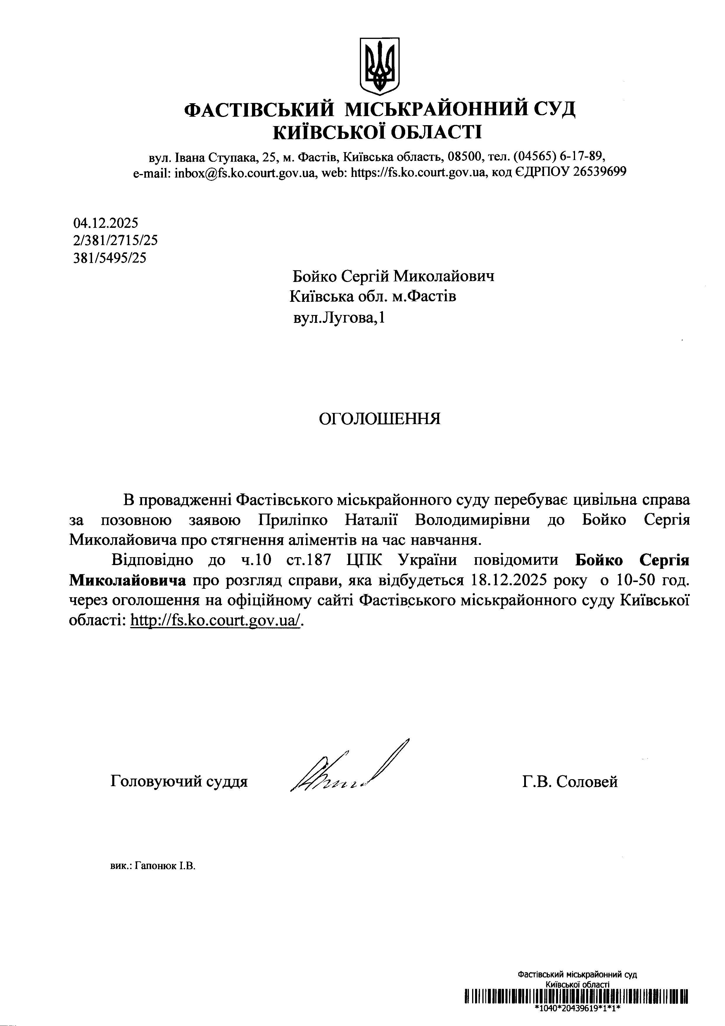 Бойко Сергій Миколайович Київська обл. м.Фастів вул. Лугова,!