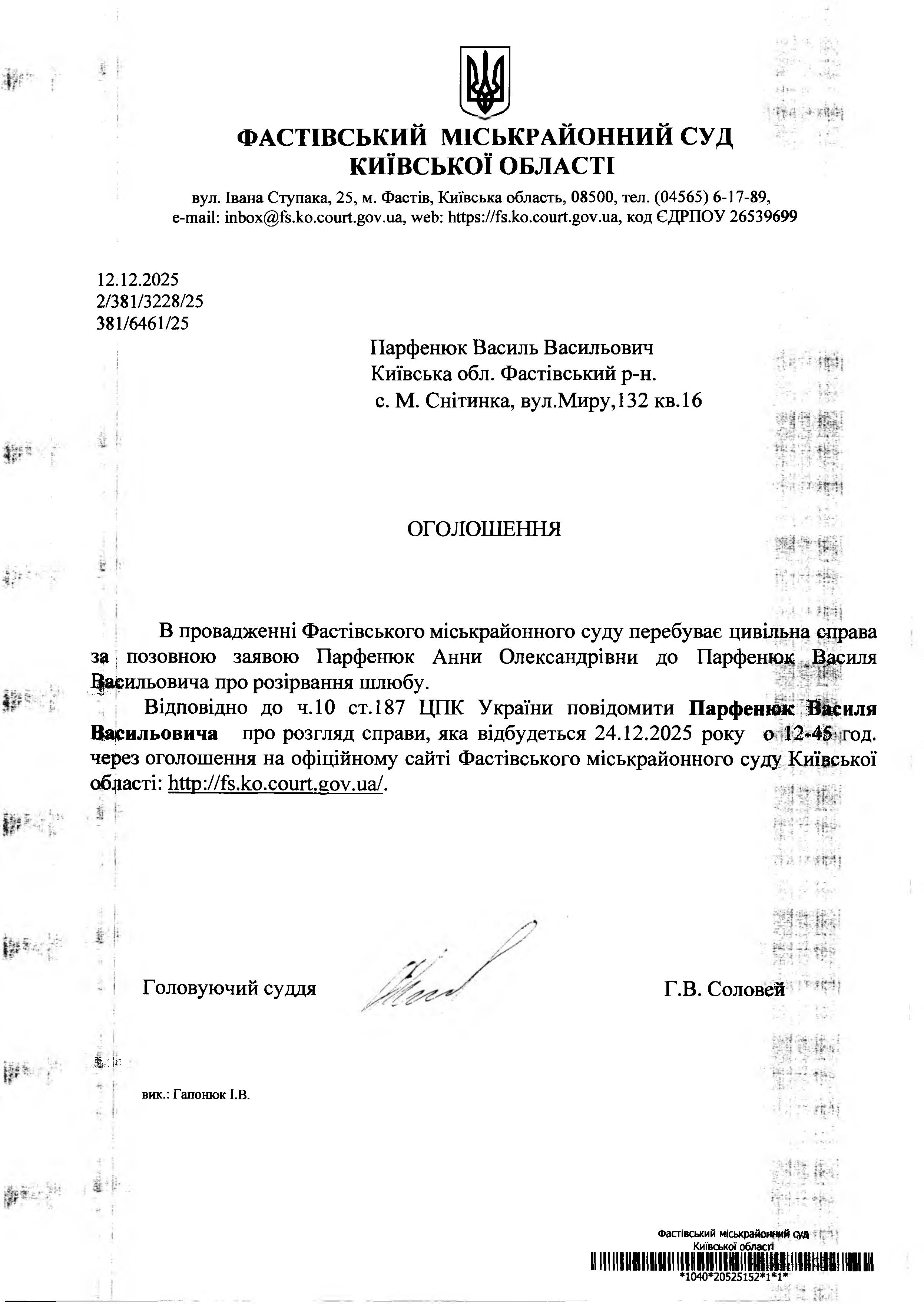 Парфенюк Василь Васильович Київська обл. Фастівський р-н. с. М. Снітинка, вул.Миру,132 кв.16